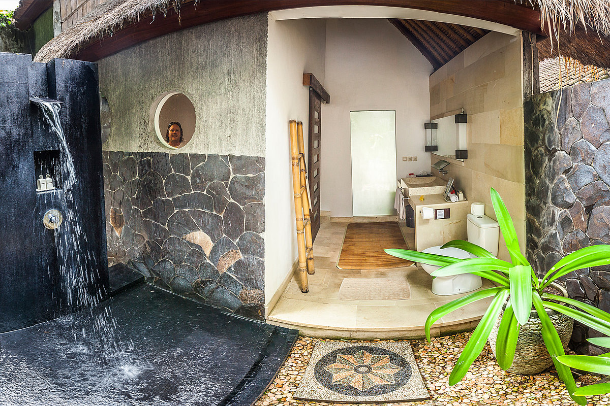 The bathrooms are located at the back of the bungalows, partly covered (toilet and sink) and partly outdoor (shower). It’s a great feeling having a shower under the open sky. The furnishings combine modern style and Balinese tradition and are comfortable and cozy.