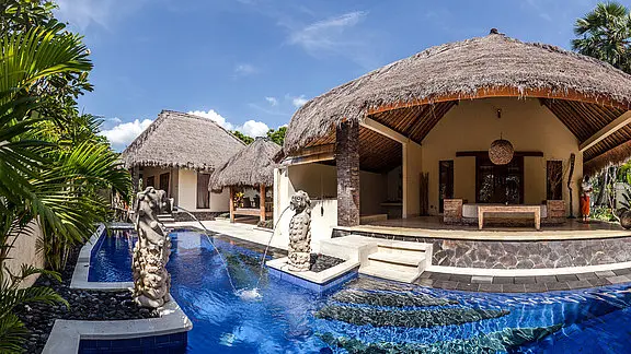 Sendiri, our single bungalow, is located very centrally, right next to the pool. It is air-conditioned and has similar furnishings to the double bungalows, but is somewhat smaller. The bathroom is also partially open (shower) and partially roofed (washbasin and WC). You have a direct view onto the pool from the small terrace.