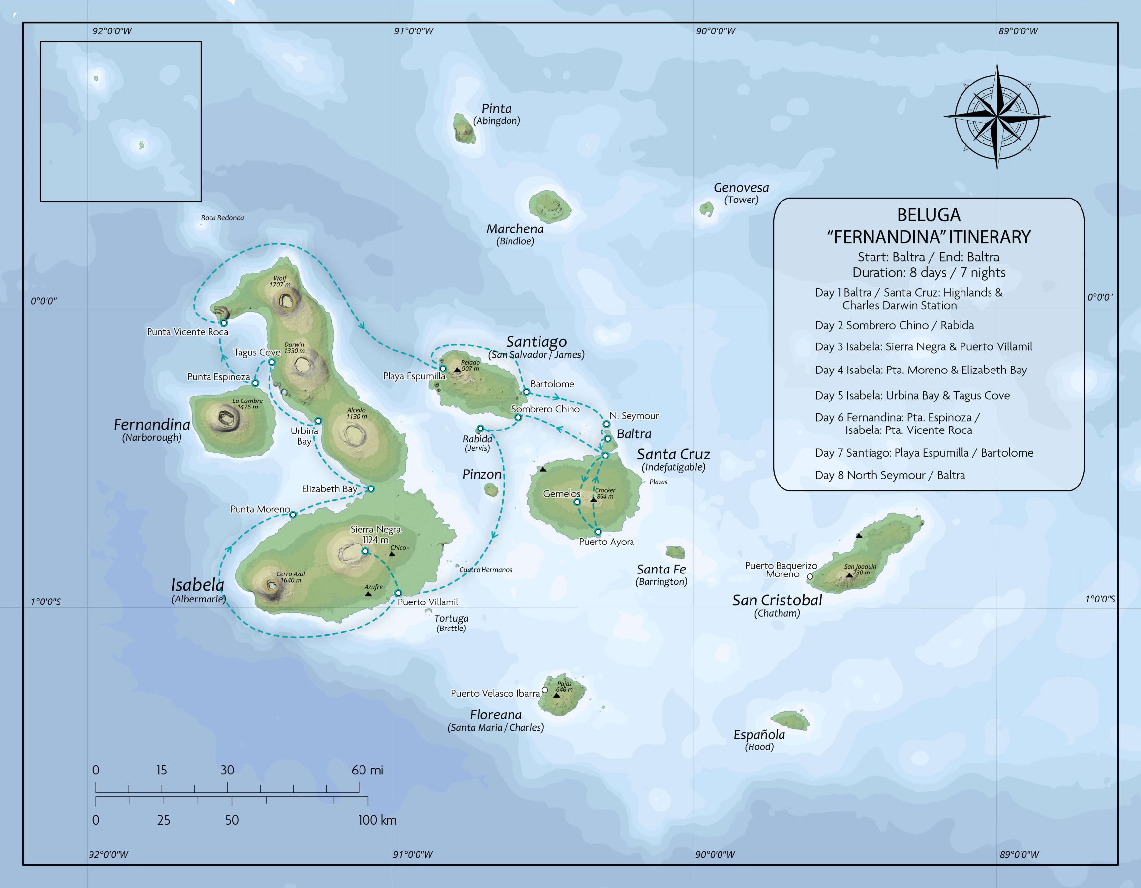 The Beluga yacht trip “Fernandina” itinerary focuses on the Central and Western Islands, including visits to Western Isabela and Fernandina Island, two highlights of the Galapagos Islands.