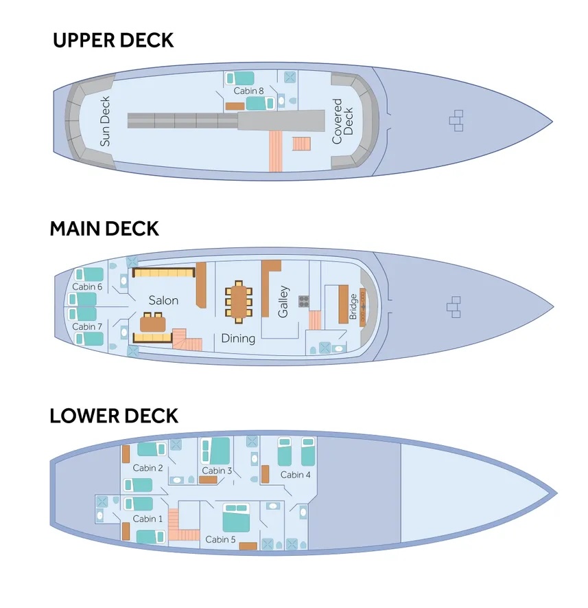 Catering to just 16 passengers, the Beluga yacht has 8 double or twin-bedded cabins. Each cabin has AC, security safe and private bathrooms with hot & cold showers.