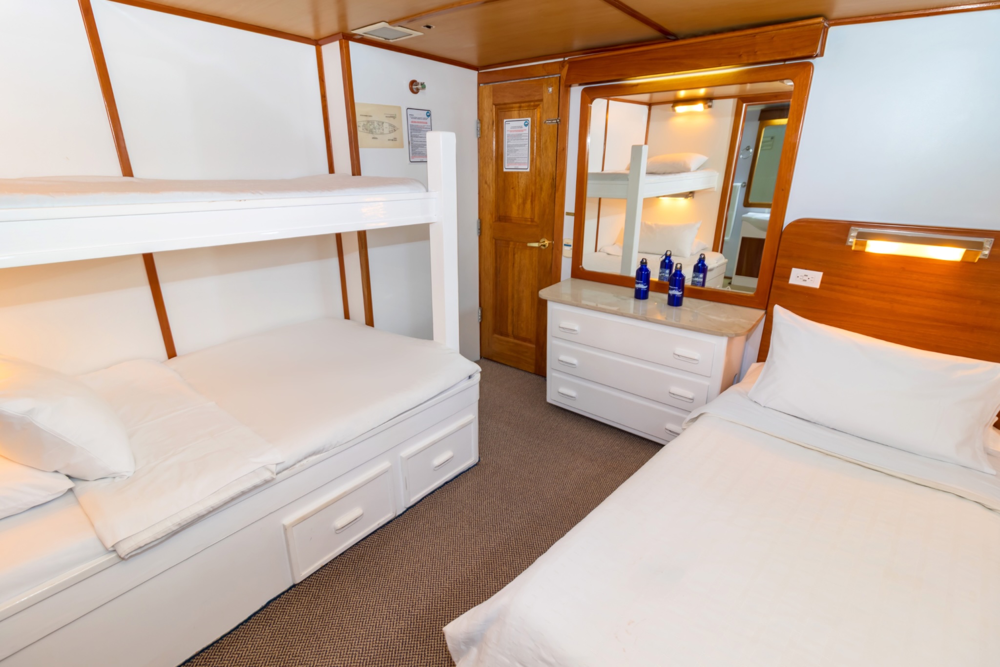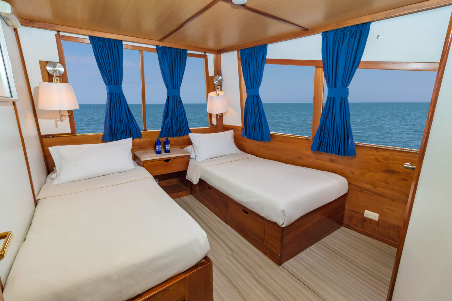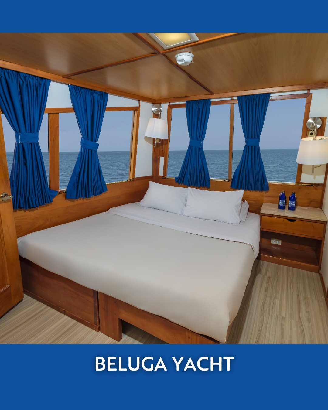 Embark on our very spacious and comfortable “Superior First Class” motor yacht with panoramic windows in the salon and great deck space to enjoy your holiday. The motor yacht Beluga is a fantastic way to cruise the Galapagos Islands in speed and style.
