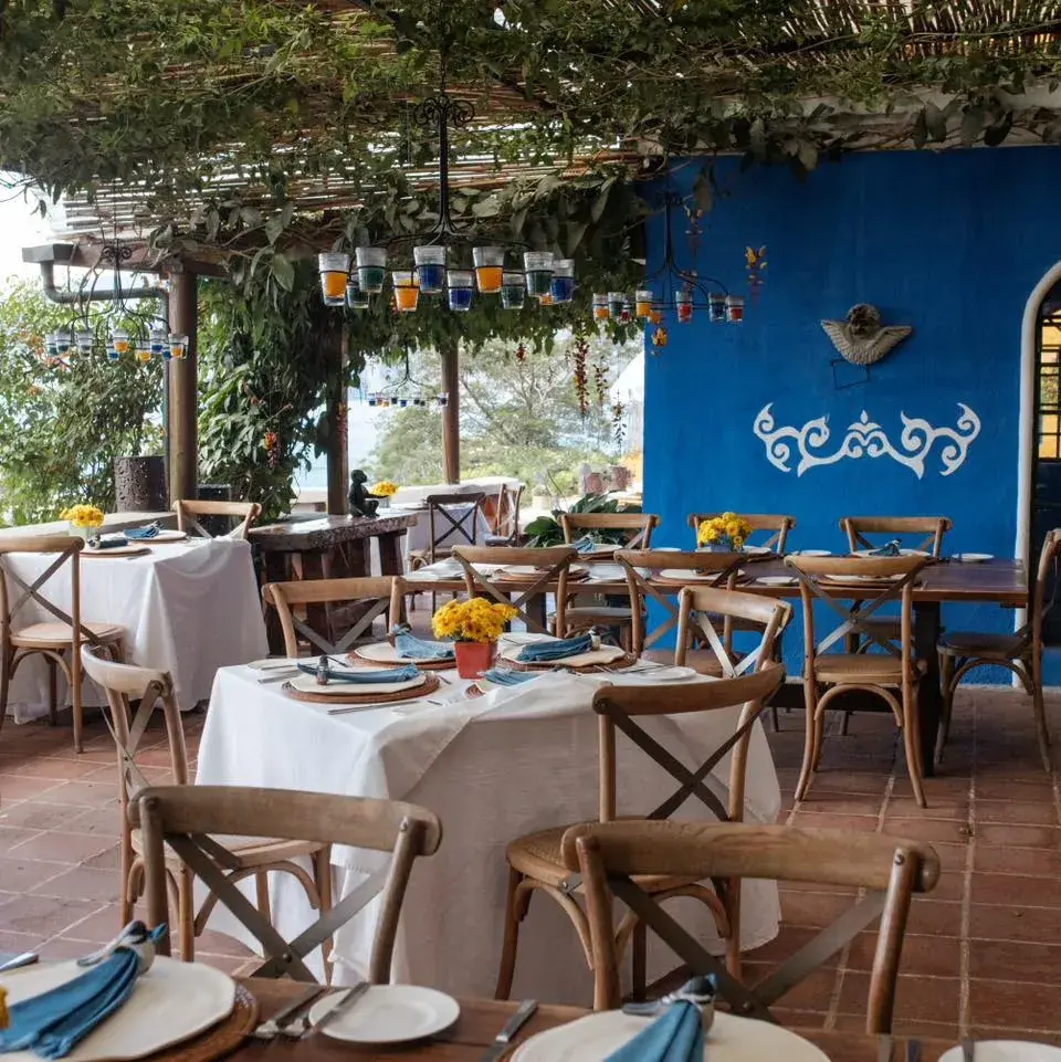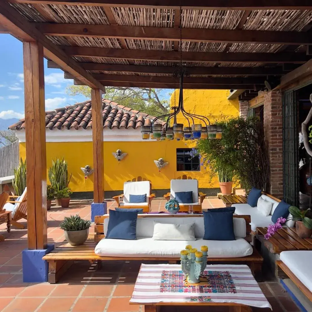 The living area of the main hotel building provides a comfortable place for guests to relax and peruse the amazing collection of photographs, artisan work and antiques that fill the space. This area opens up with wide glass doors to the terrace and restaurant, with views of the lake below and three volcanoes on the horizon; and allows the breezes and sunshine to flow in. To the left of this area is a cozy bar with an authentic, old-fashioned jukebox and small seating area to enjoy a handcrafted cocktail created just for you.