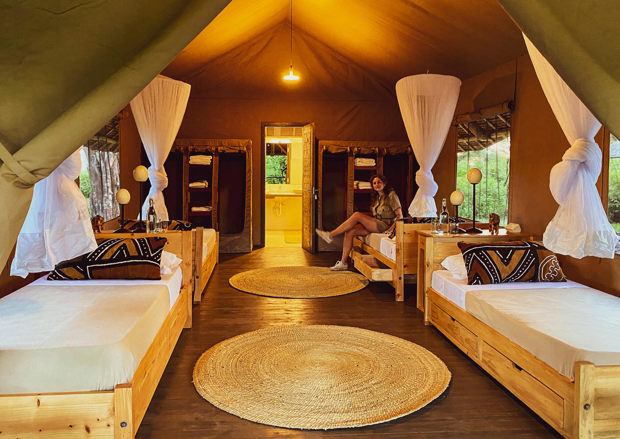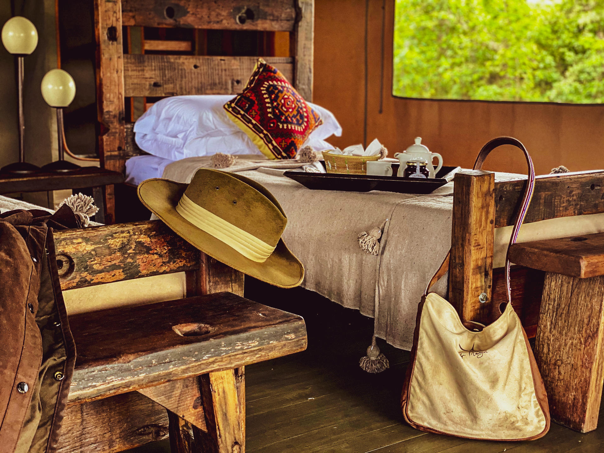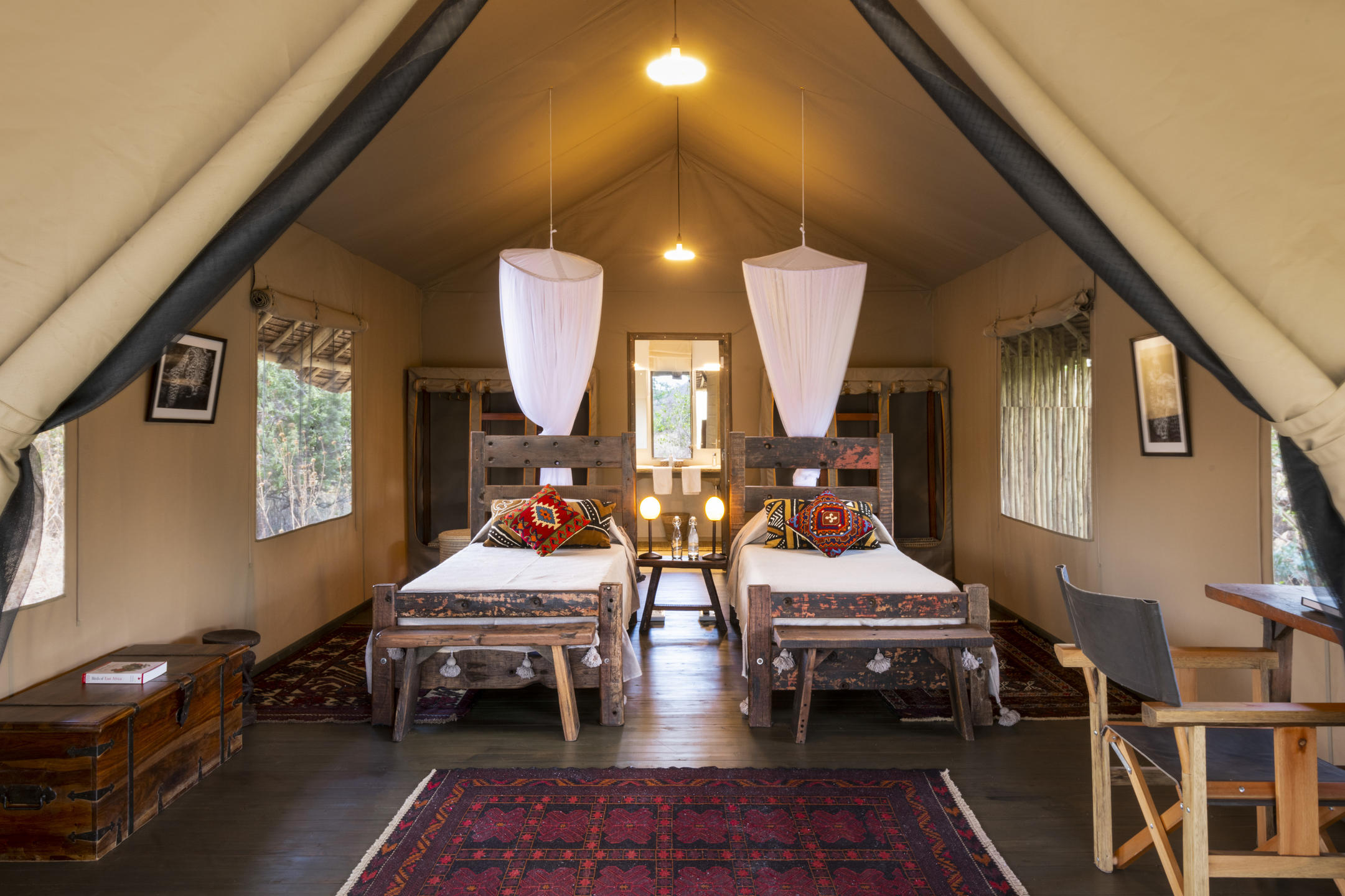 (3 ROOMS) The Luxury Tented Cottage features two comfortable single beds with mosquito netting, bedside tables and lighting, ample storage, and a writing desk. A few Persian rugs adorn the floor, and every tent boasts an en-suite washroom with indoor and outdoor showers. An additional layer of canvas extending beyond the entrance forms a private veranda with outdoor seating where guests can relax and enjoy a beautiful view.