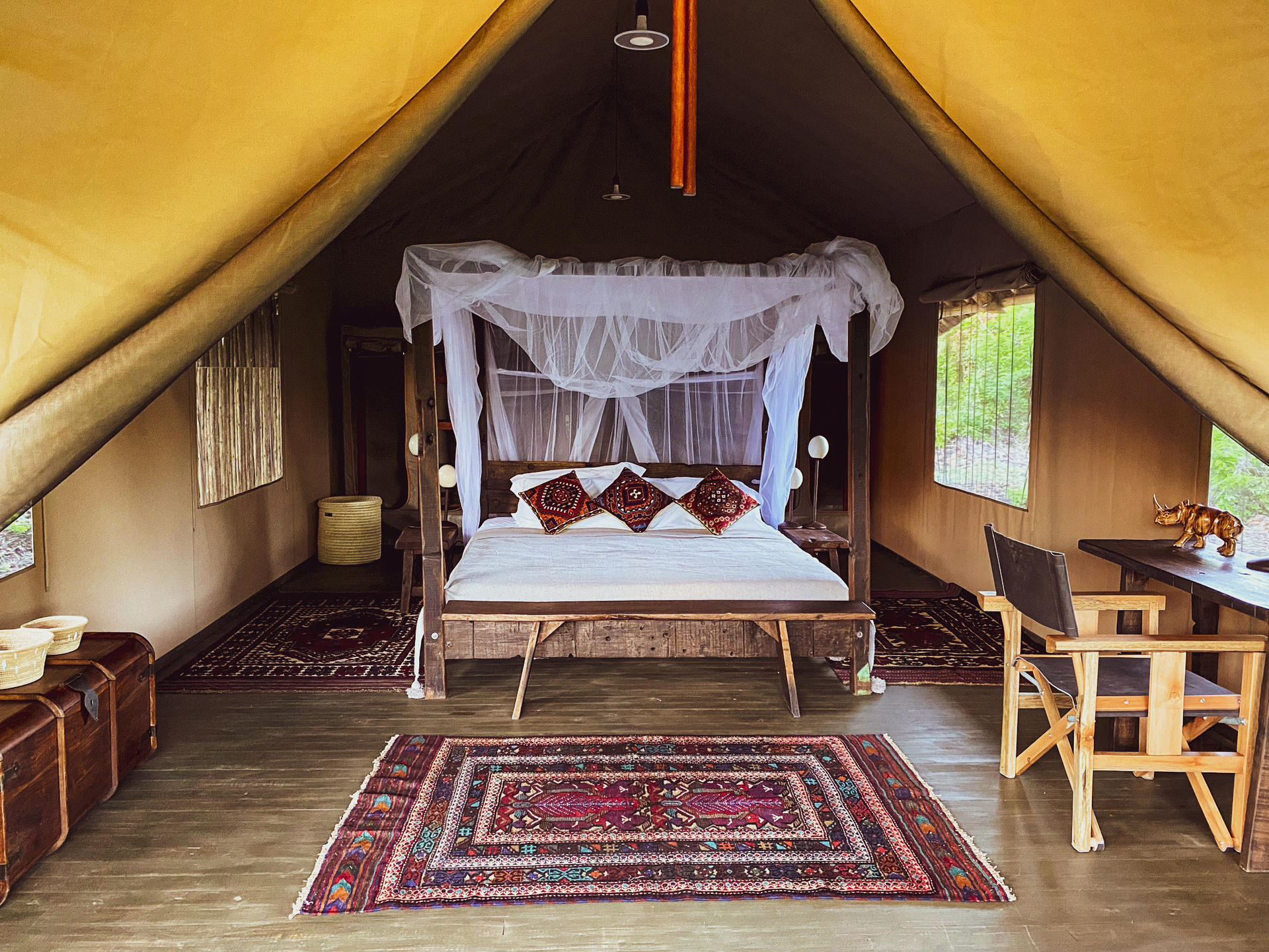 (3 ROOMS) The Luxury Tented Cottage features a four-poster double bed with mosquito netting, bedside tables and lighting, ample storage, and a writing desk. A few Persian rugs adorn the floor, and every tent boasts an en-suite washroom with indoor and outdoor showers. An additional layer of canvas extending beyond the entrance forms a private veranda with outdoor seating where guests can relax and enjoy a beautiful view!