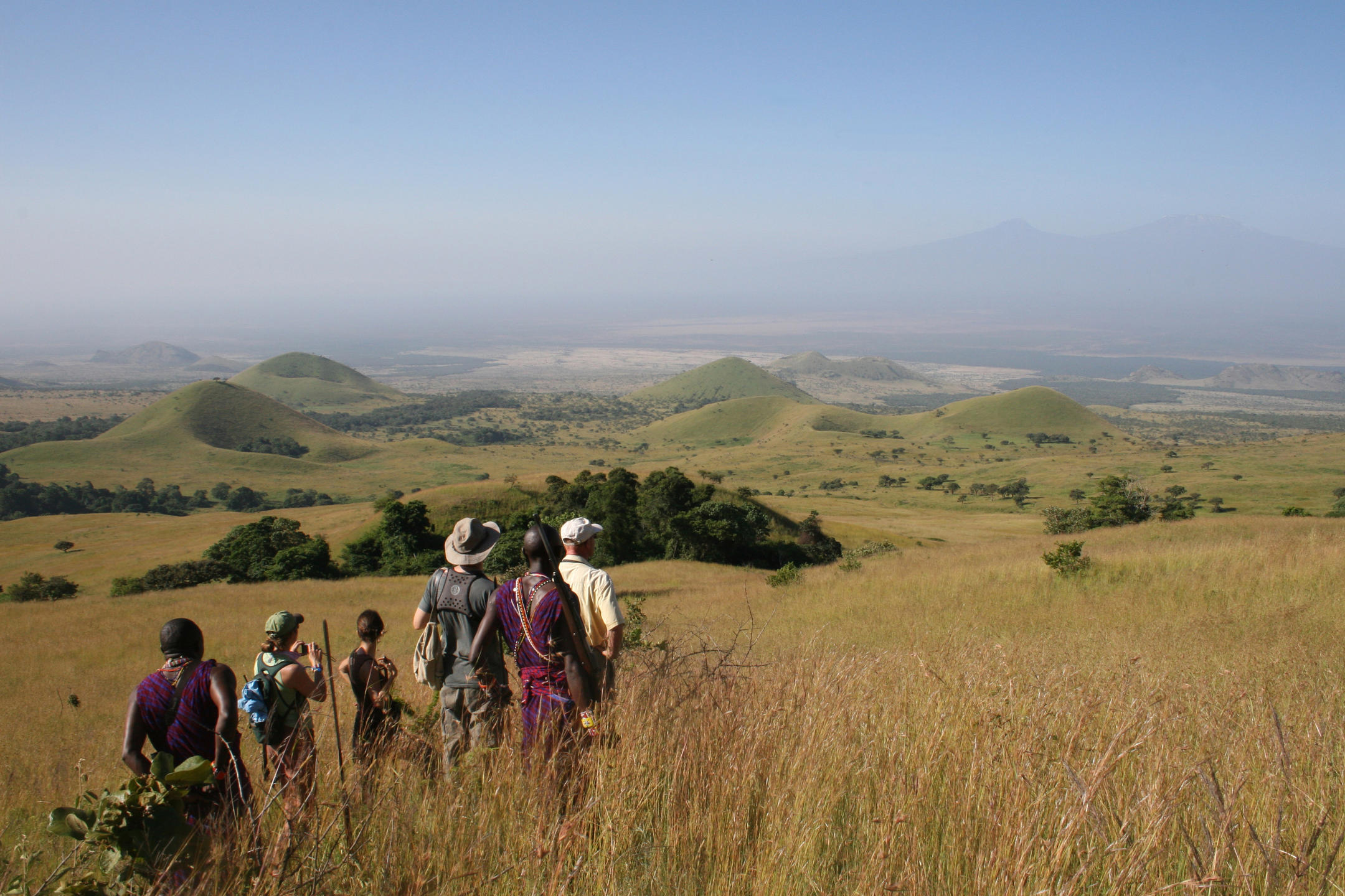With us you can do more than just stretch your legs, you can walk for days. Stroll down through the foothills to the granite-topped outcroppings at the edge of the savanna and climb up for a view of the Savannah. Take a longer day hike across the hills and plains, accompanied by your experienced Maasai scouts, learning to read the signs of the animals and hearing how the landscape was formed, crossing over ancient lava flows and ending in a tented camp under a baobab tree for the night. Or, best of all, take the rarest of walks up into the Green Hills and through the Chyulu Cloud Forest: wild forest hogs, rare Turaco birds, huge silver-cheeked Hornbills, antelope, elephant…all under the cool shade of giant strangler fig trees that rival the strangest most mystical trees in the world.