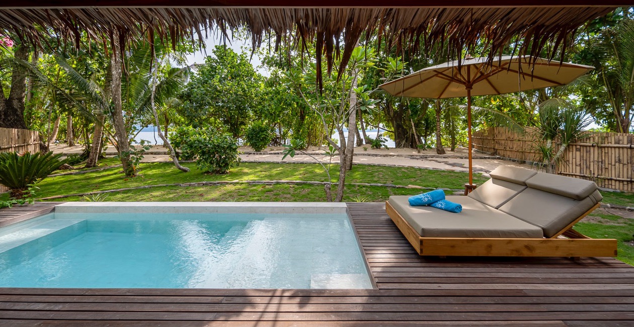 Set directly on the beach, these 4 villas open to sweeping sea views and offers private access to the sand. With 150 m² of generous indoor and outdoor space, it is ideal for couples or families seeking privacy and comfort. The master bedroom features a king-size bed with premium linens and opens onto a teak deck facing the private pool and ocean. A walk-in wardrobe with a make-up console connects to the open-air ensuite bathroom, which includes a double indoor rain shower. The second room can serve as an additional bedroom or private lounge, equipped with a Smart TV and overlooking a secluded garden.