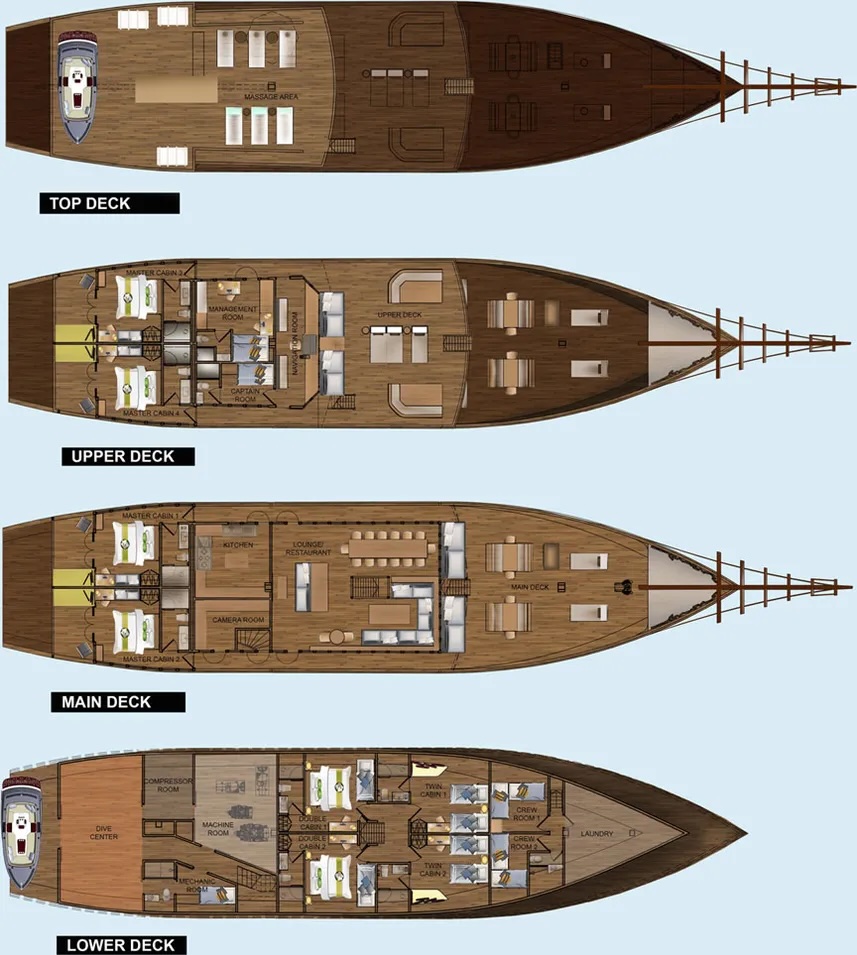 The main deck features a full-width camera room designed for underwater photographers, along with an elegant air-conditioned lounge and dining area for refined service between dives. Complimentary satellite WiFi keeps guests connected when coverage allows, and an onboard masseuse provides soothing treatments on the sky deck, the perfect retreat after exploring Indonesia’s world-class dive sites in Raja Ampat, Banda Sea or Komodo.