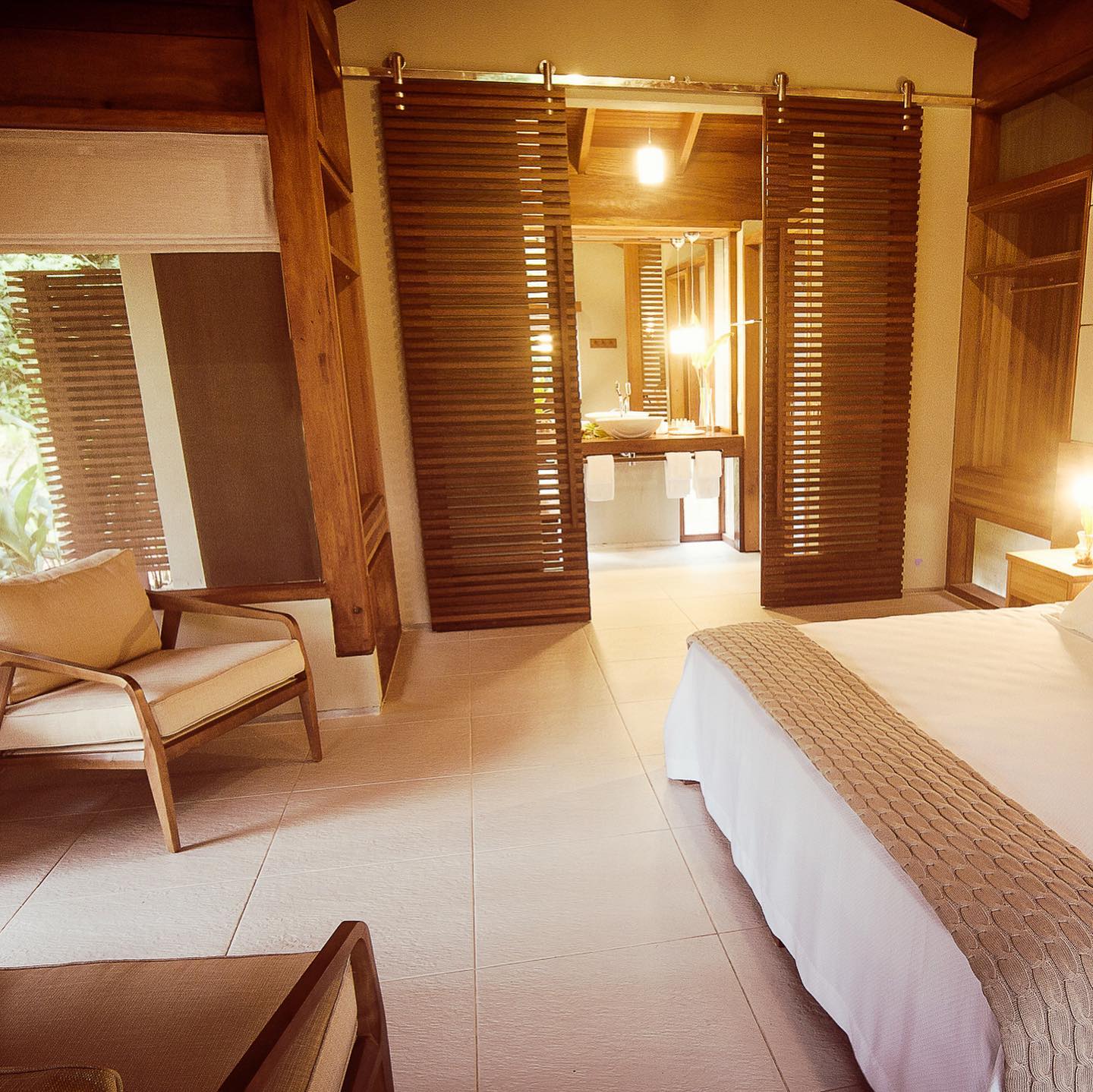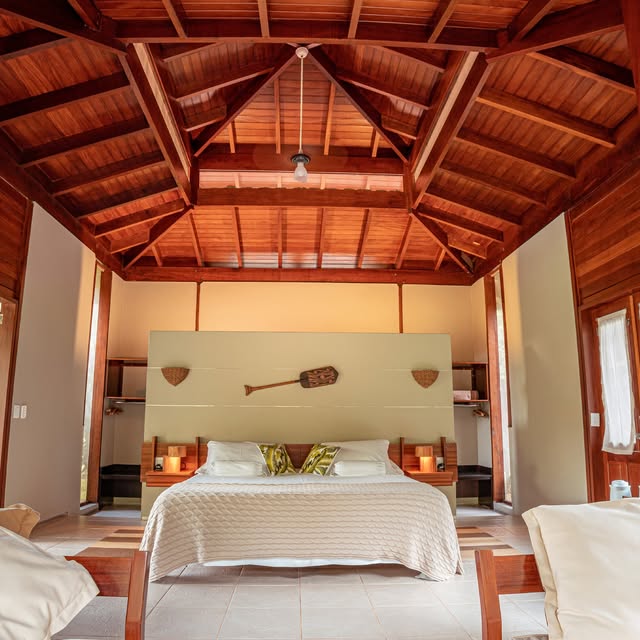 Complete immersion in nature is further assured by keeping things intimate, with only 18 guest dwellings. Housed in breezy bungalows and cottages with lofty ceilings, organic materials, and private outdoor spaces like verandas and gardens, all of the property’s buildings showcase sustainable architecture that fits into its rainforest home. Studying the site’s wind patterns allowed architects to design buildings that use natural airflow for cooling, and solar panels provide renewable power.