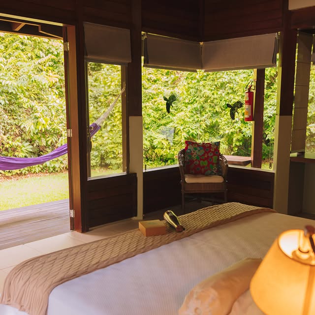 This accommodation has a private garden with ornamental plants and an additional refreshing outdoor shower, ideal for cooling off on a sunny day. The writing desk with a view of the forest is perfect for stimulating one’s creativity in the middle of the Amazon.