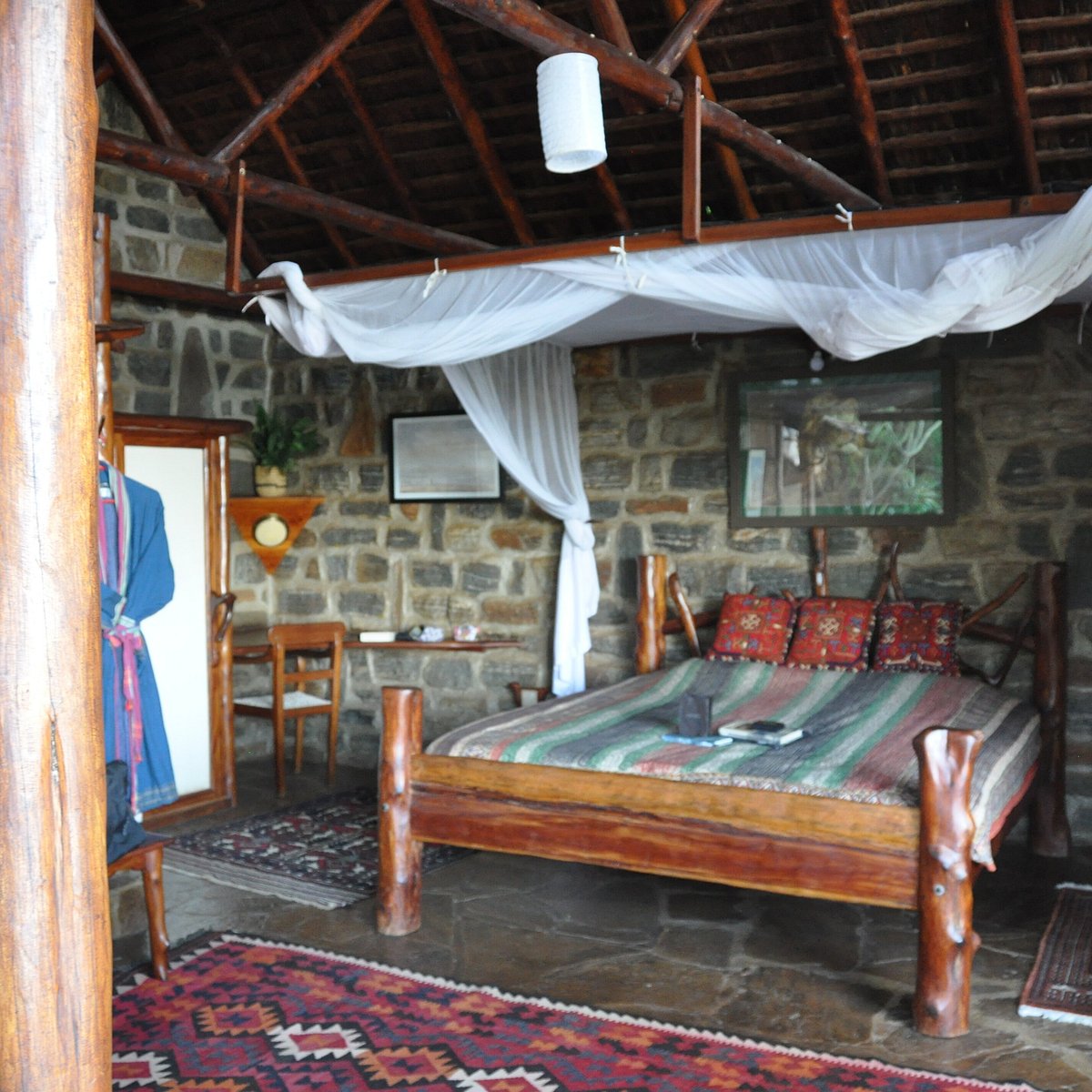 Desert Rose has just five rooms accommodating a maximum of 12 guests. Cut into the rock of the hillside, they feature stone walls, slate floors, hand-woven rugs and are furnished with unique carved wooden chairs and tables and four-poster beds – all made of local materials, all environmentally sustainable. This wood-carving is a particular feature of Desert Rose: even the soap dishes are made of hand-hewn hardwood. Open-air bathrooms with sunken baths and recessed washbasins complete the Lodge’s sensual, organic feel. The rooms accessed by paths and steps, all have screens and shutters and can be as private or open as the guest wishes. Two of the rooms are doubles, two twins, one a family house sleeping four. There’s a dining room serving home-grown organic meals, a lounge and a small library.