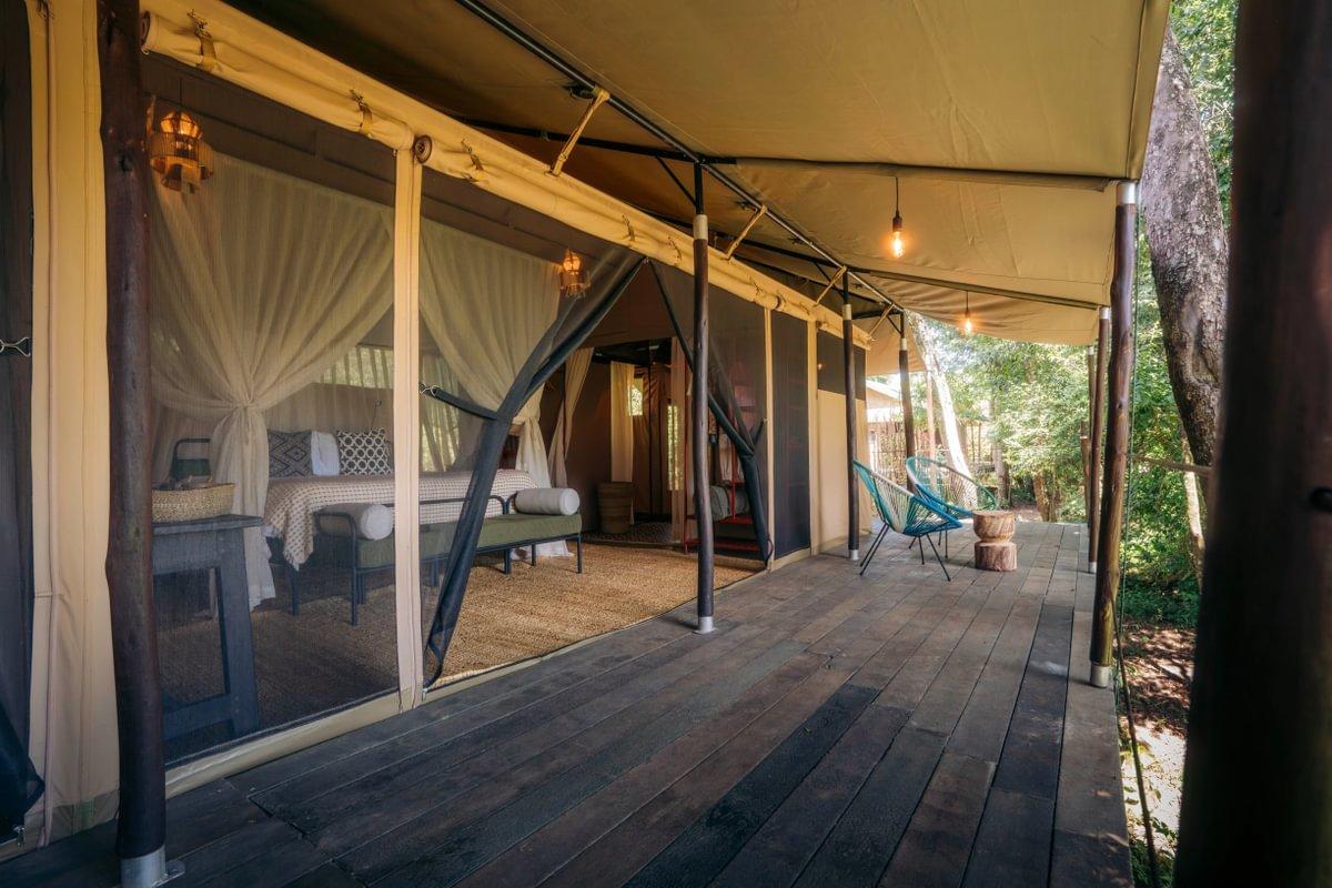 Like Emboo's Guest Tents, the Family Tent is tucked into the tree canopy with river views, designed with natural materials and interiors inspired by the colors of the Lilac Breasted Roller. The tent accommodates families with children aged 5 years and older, offering comfortable, modern accommodation with proximity to nature.
