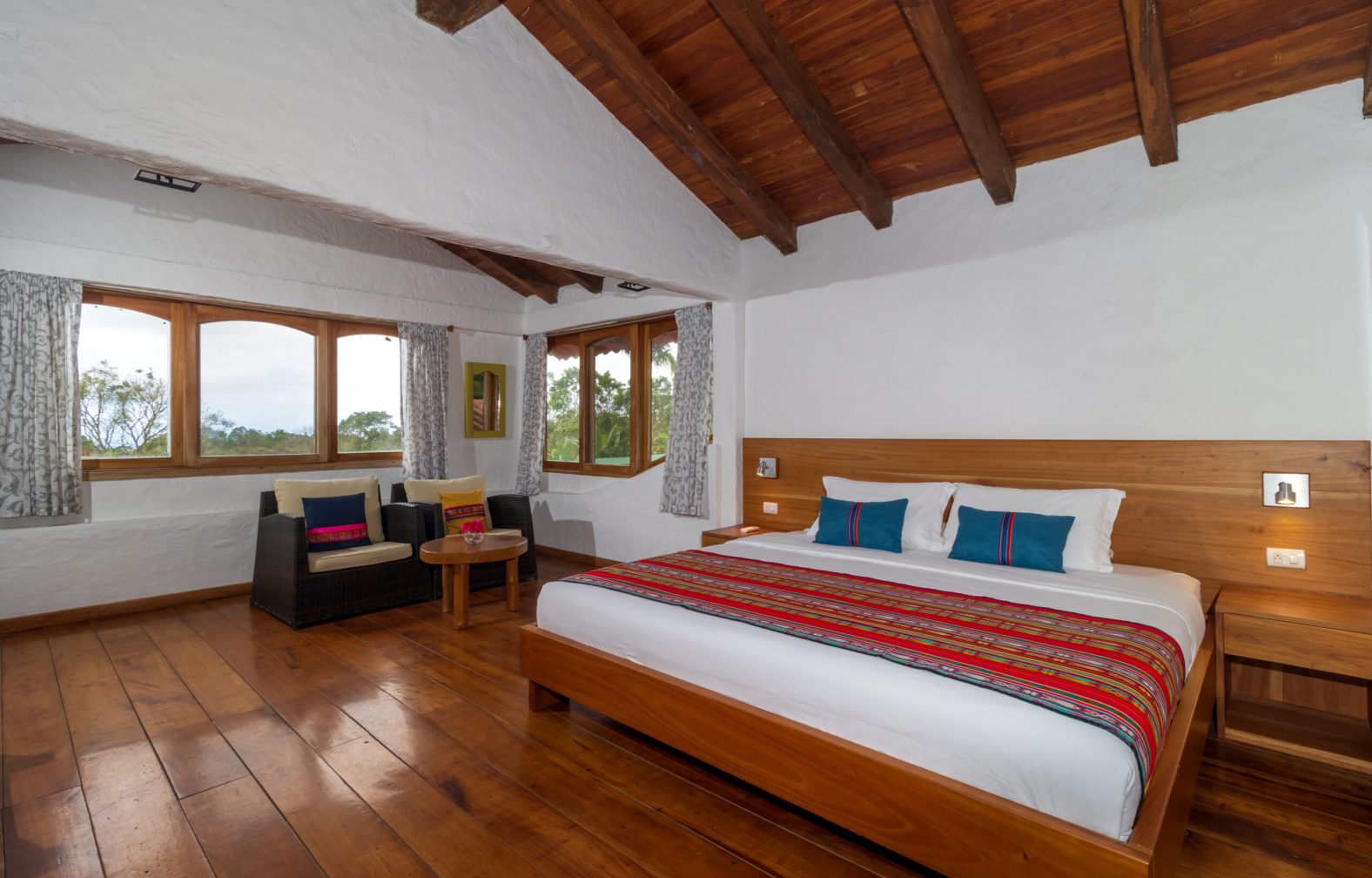 This comfortable, airy and spacious room is located on the 2nd floor, providing extensive views of the surrounding lush forest and grounds. The rich and warm tones of Galápagos Cedrela wood are complemented by locally designed art and textiles. The high-quality, soft sheets and comfortable bed are bound to provide you with a luxurious sleep. This room is outfitted with fans and air-conditioner, as well as a heater for the cooler season, a private en-suite bathroom with a soothing waterfall shower fitted with hot and cold water, and a cozy sitting area.
