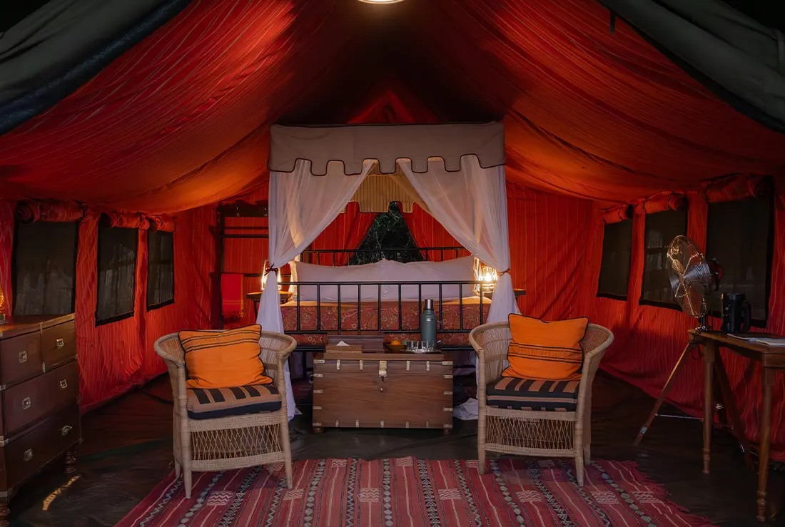 The camp feels gently nostalgic and beautifully connected to the wilderness around it. The mess tent holds the spirit of camp life: carefully curated furniture, bone-handled silver cutlery, a small library and a well-stocked drinks cabinet. Whether gathered under canvas or beneath the open sky, dining is unfussy. Meals are prepared with care and enjoyed slowly, while easy conversations around the fire draw you into the night.