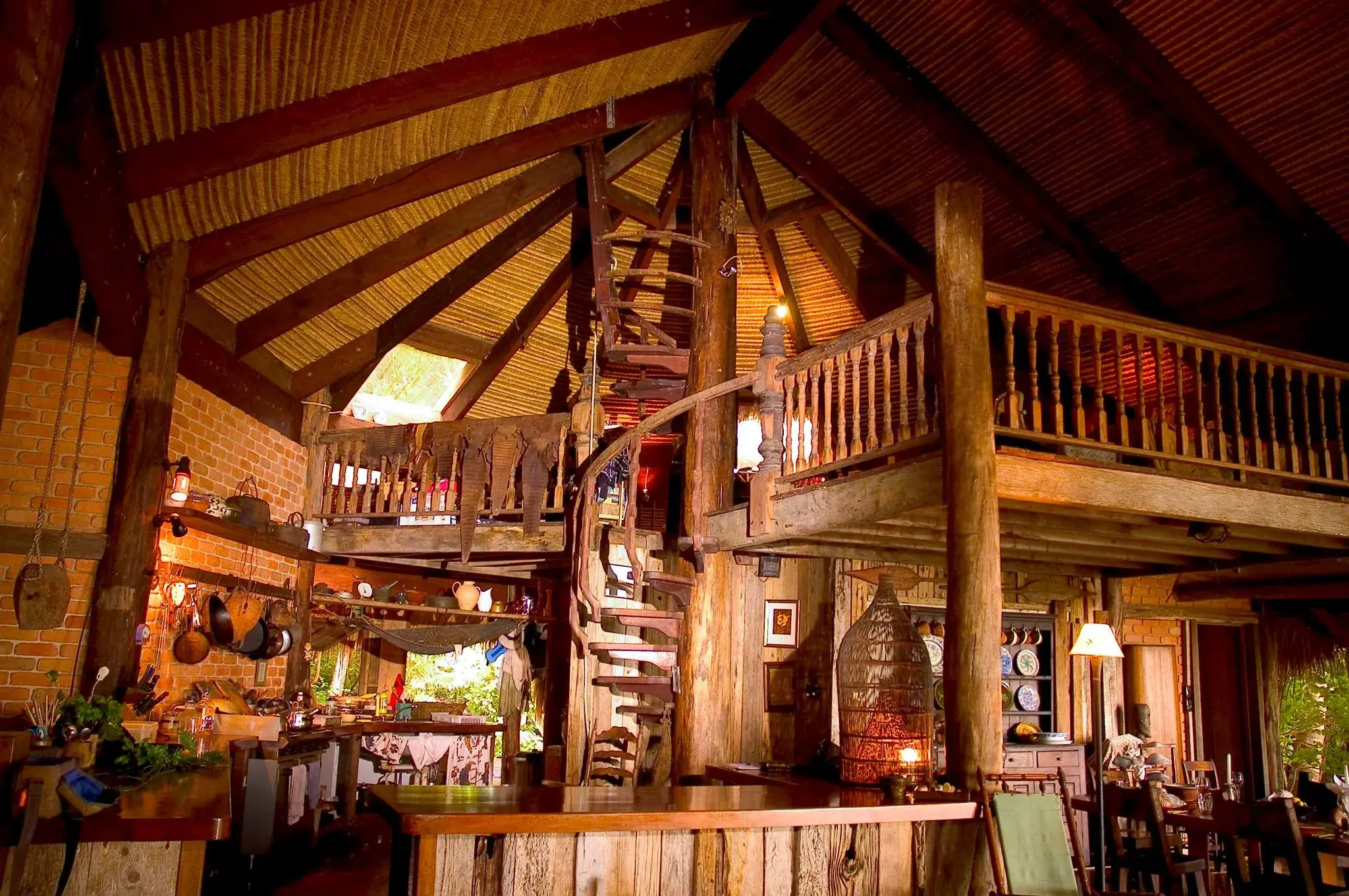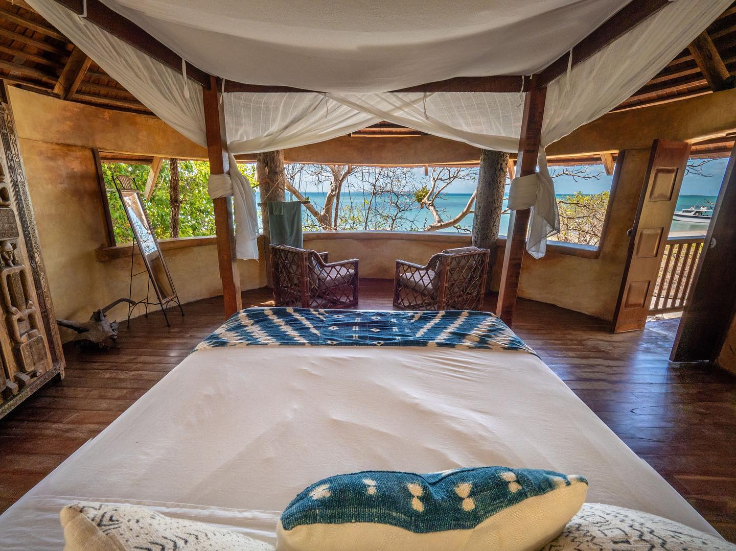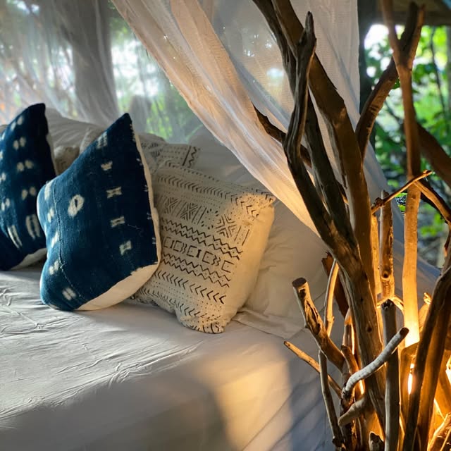 Designed with an African Moroccan theme, this 3-bedroom villa is a premier residence. It has two queen bedrooms, two open air bathrooms, an open plan kitchen lounge area with a stone fire place, library and loft with two singles. The building is covered with a thatch roof and supported by a colossal drift wood center pole washed in from the forests of New Guinea. It is the ultimate designer's dream of island seclusion.