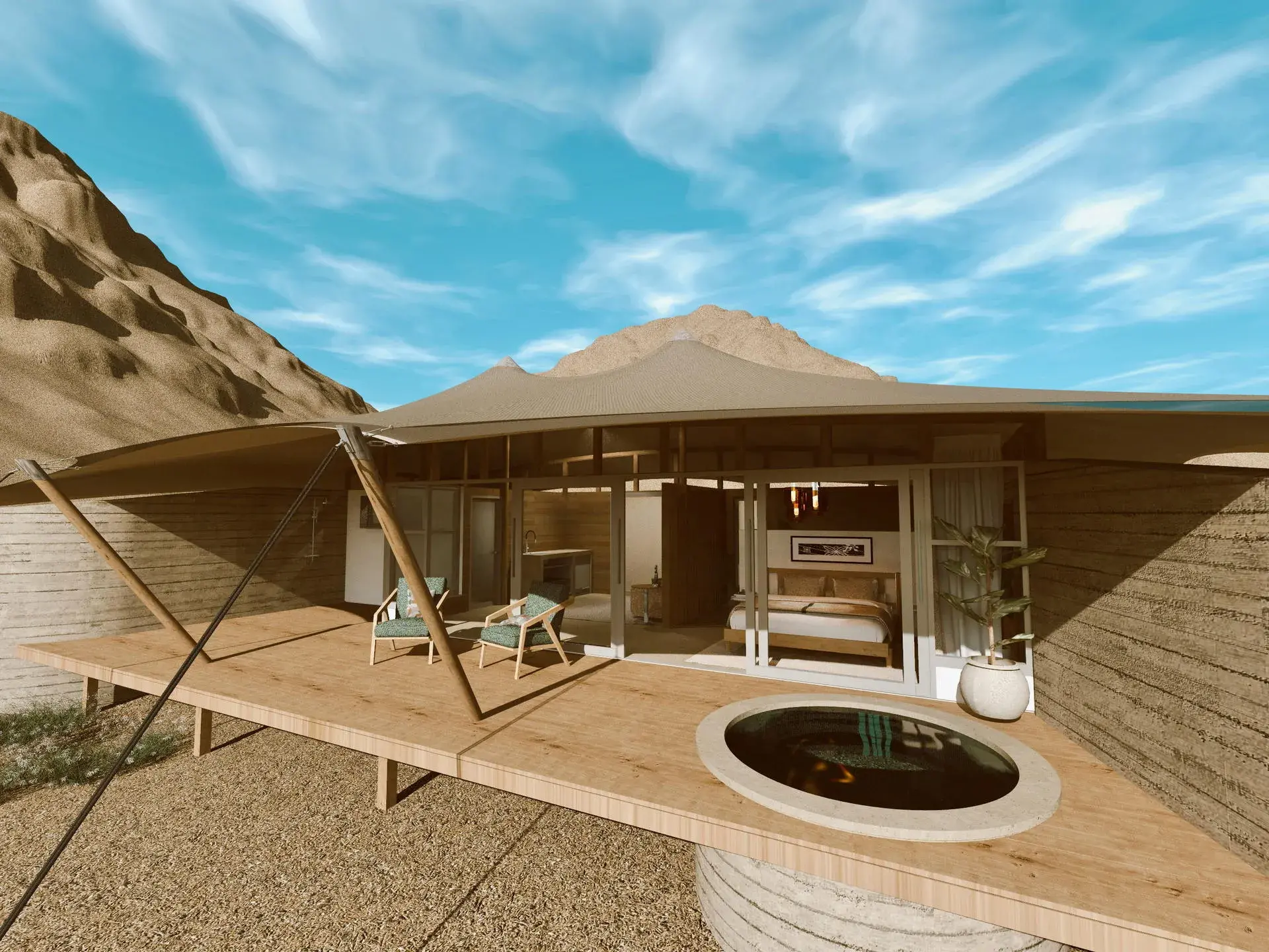 The 10 spacious guest rooms (comprising of 8 twin and 2 family units) are each thoughtfully designed with exceptional comfort, stunning desert views and sustainability in mind. The room design includes rammed earth walls and heavily insulated canvas roofs that offer natural climate control—cool in summer and warm in winter.