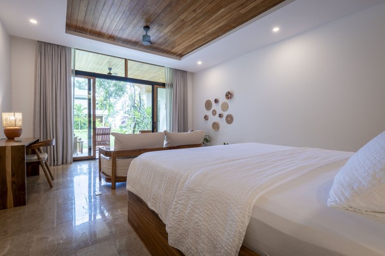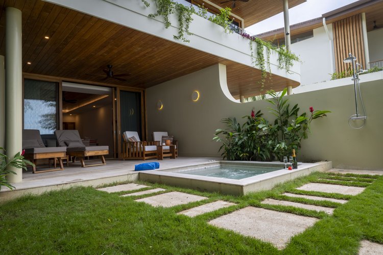 The two Beachfront Garden Rooms are situated on the ground floor and both have spectacular ocean vistas. The spacious bathrooms each have a shower and a Jacuzzi. Wide sliding doors open up onto a contemporary, tropical terrace with a wooden deck that offers an amazing ocean view which can be enjoyed while lying in the hammock.