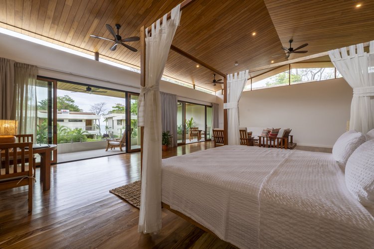The two Beachfront Suites with Balconies are located on the upper floor and are ideal for honeymooners and couples in general. Equipped with a king-size bed, a seating area, a shower with an indoor garden, and a balcony with sun loungers as well as a bathtub, they offer plenty of space for a relaxing stay. After climbing the stairs, you will be rewarded with a breathtaking view of the ocean and several trees that are used by howler monkeys from time to time.