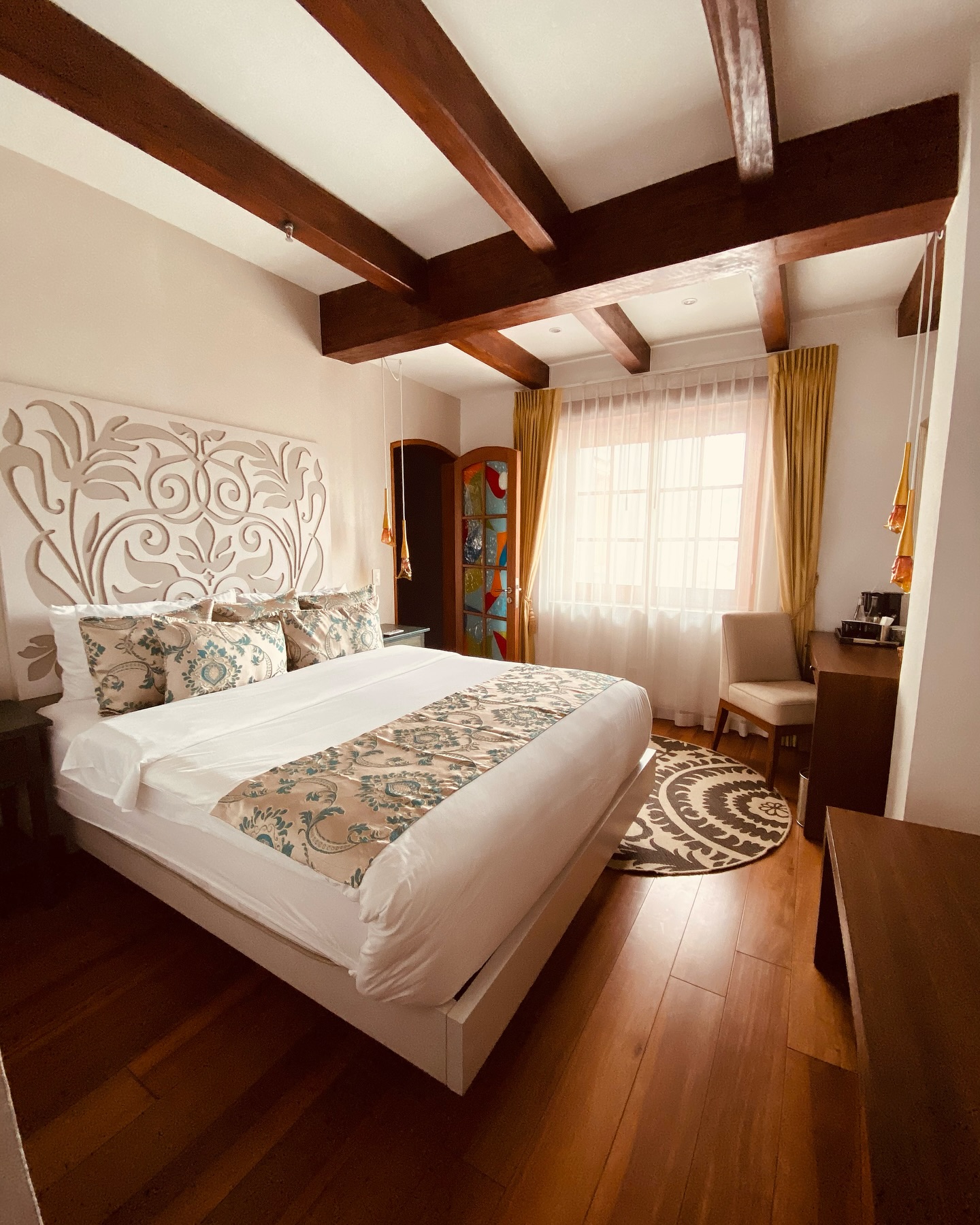Superior accommodations offer a queen-size bed with a plush pillow-top mattress system developed exclusively by Simmons for Art Hotels Ecuador. Crisp white sheets, a cozy 100% cotton duvet, and AromaVida's exclusively Ecuadorian line of organic bath amenities help rejuvenate body and soul. Sliding French doors and east-facing windows let in natural light.