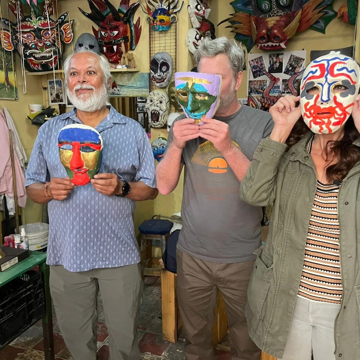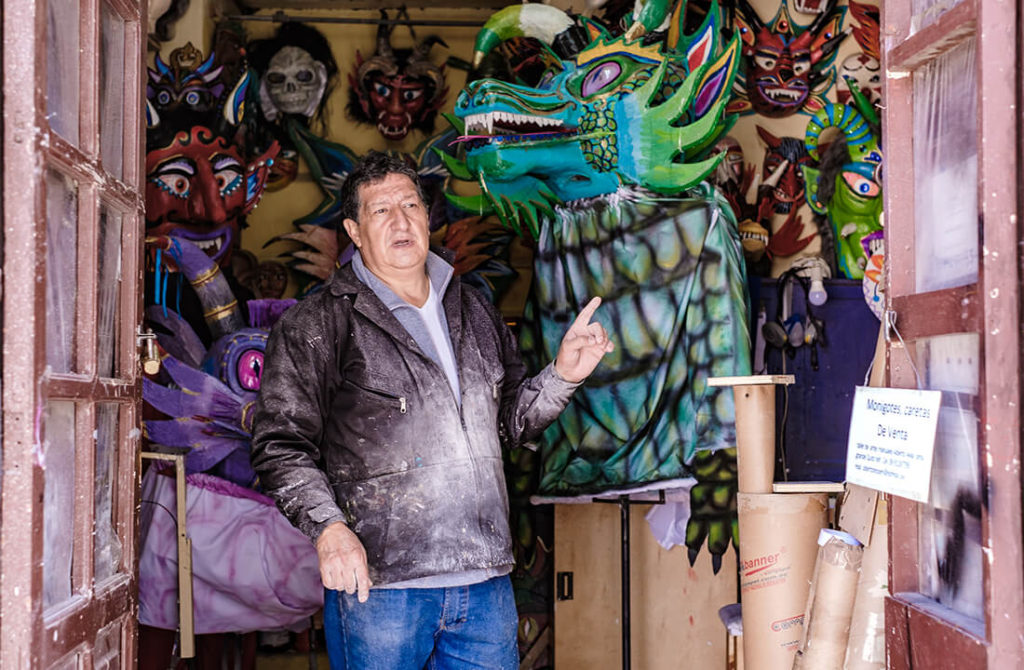 Discover the magic of the people who live and work in our neighborhood. El Caretero has been making beautiful handmade masks from paper and cardboard for over two decades. These masks are representations of Ecuadorian folk culture.