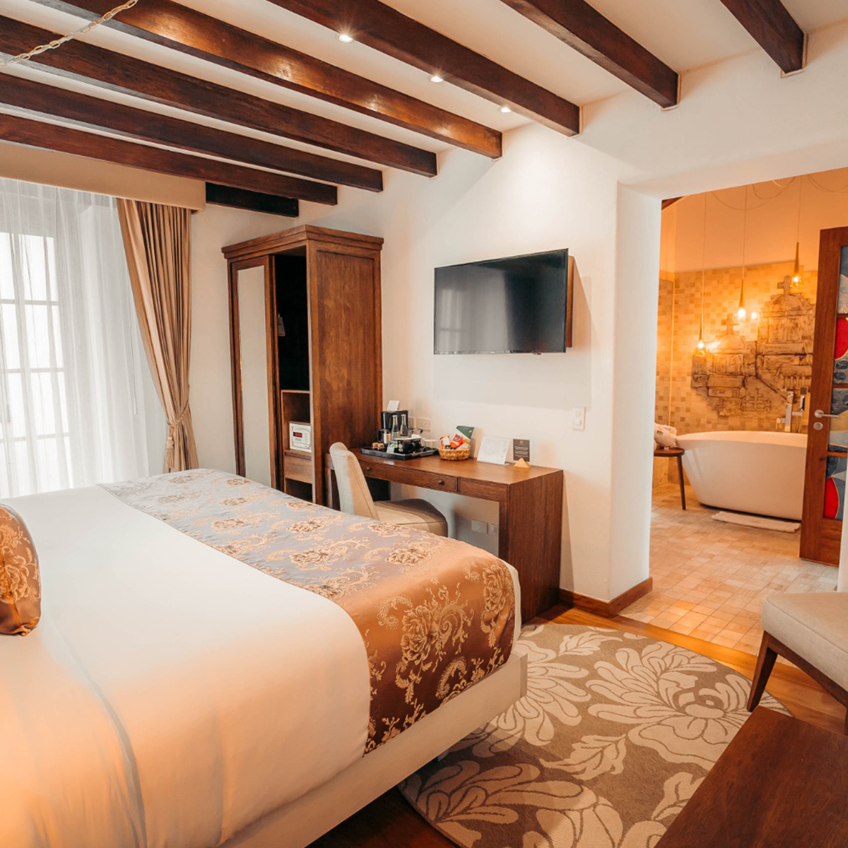 Premium accommodations offer your choice of bed size, all with a plush pillow-top mattress system developed exclusively by Simmons for Art Hotels Ecuador. Crisp white sheets, a cozy 100% cotton duvet, and AromaVida's exclusively Ecuadorian line of organic bath amenities help rejuvenate body and soul.
