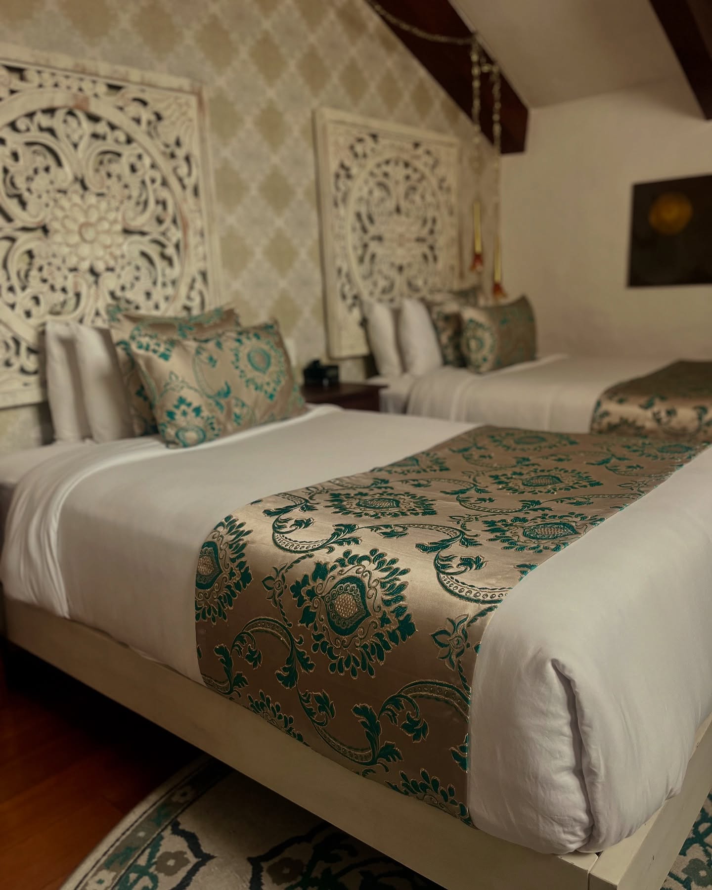 Deluxe accommodations offer a queen-size bed with a plush pillow-top mattress system, developed exclusively by Simmons for Art Hotels Ecuador. Crisp white sheets, a cozy 100% cotton duvet, and AromaVida's exclusively Ecuadorian line of organic bath amenities help rejuvenate body and soul.