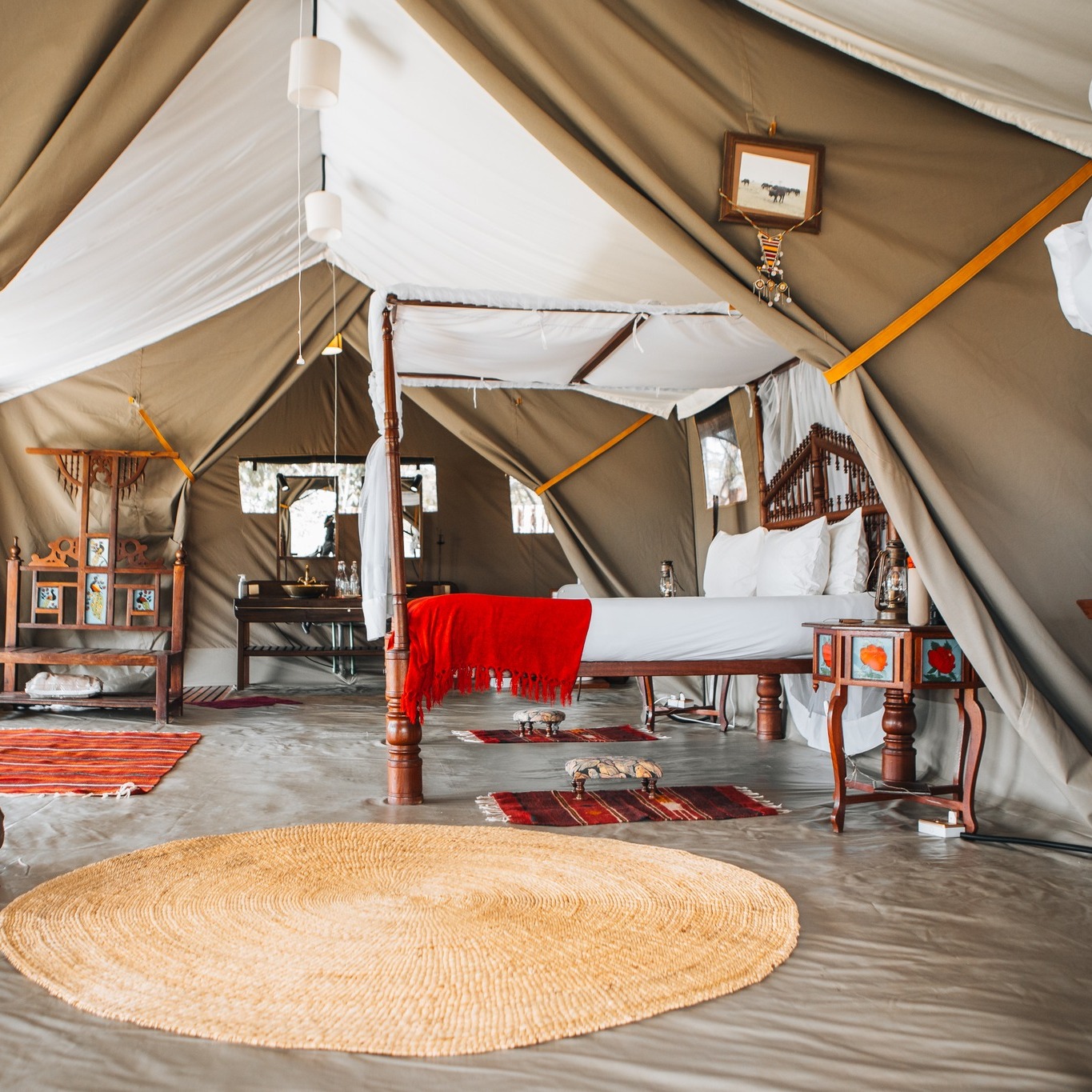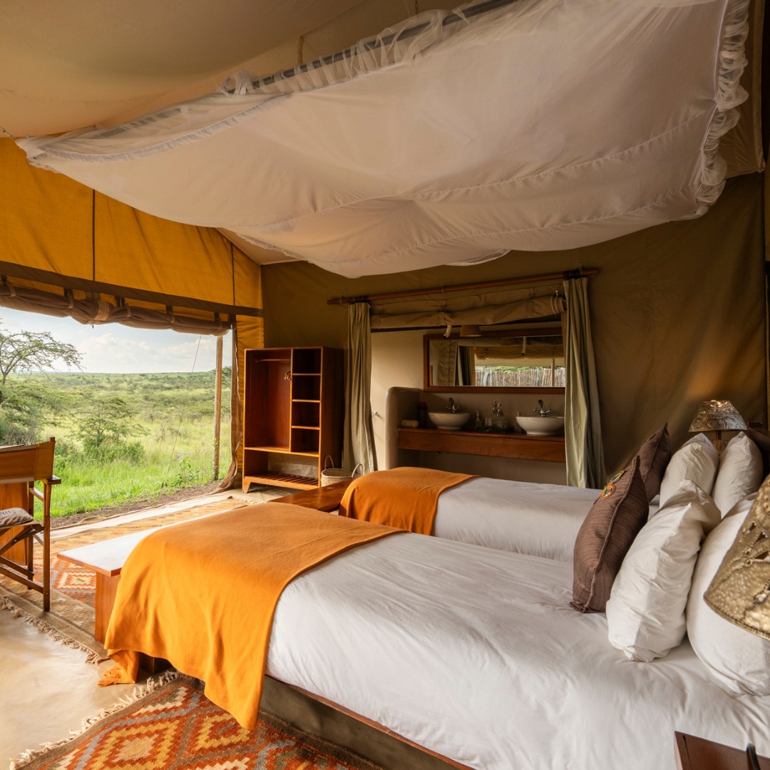 Tents 1 and 2 are interconnected by a spacious lounge, with one double and one twin tent. Ideal for families who want both privacy and shared space.