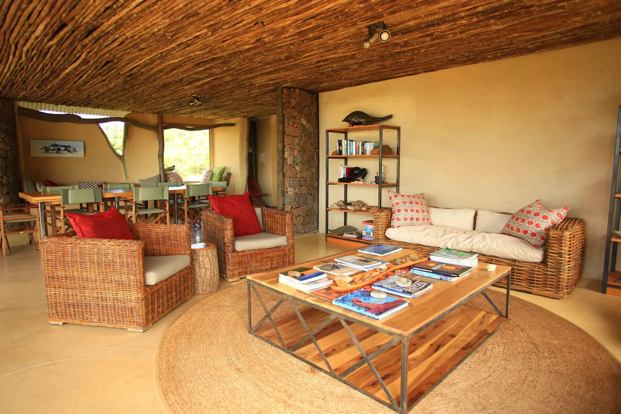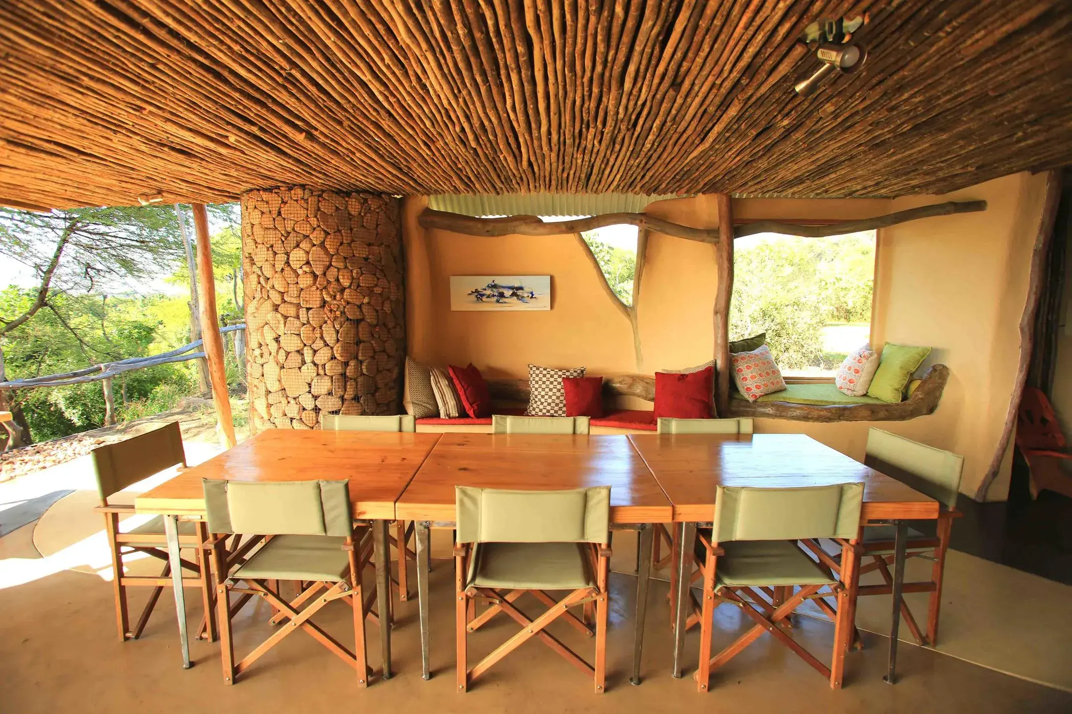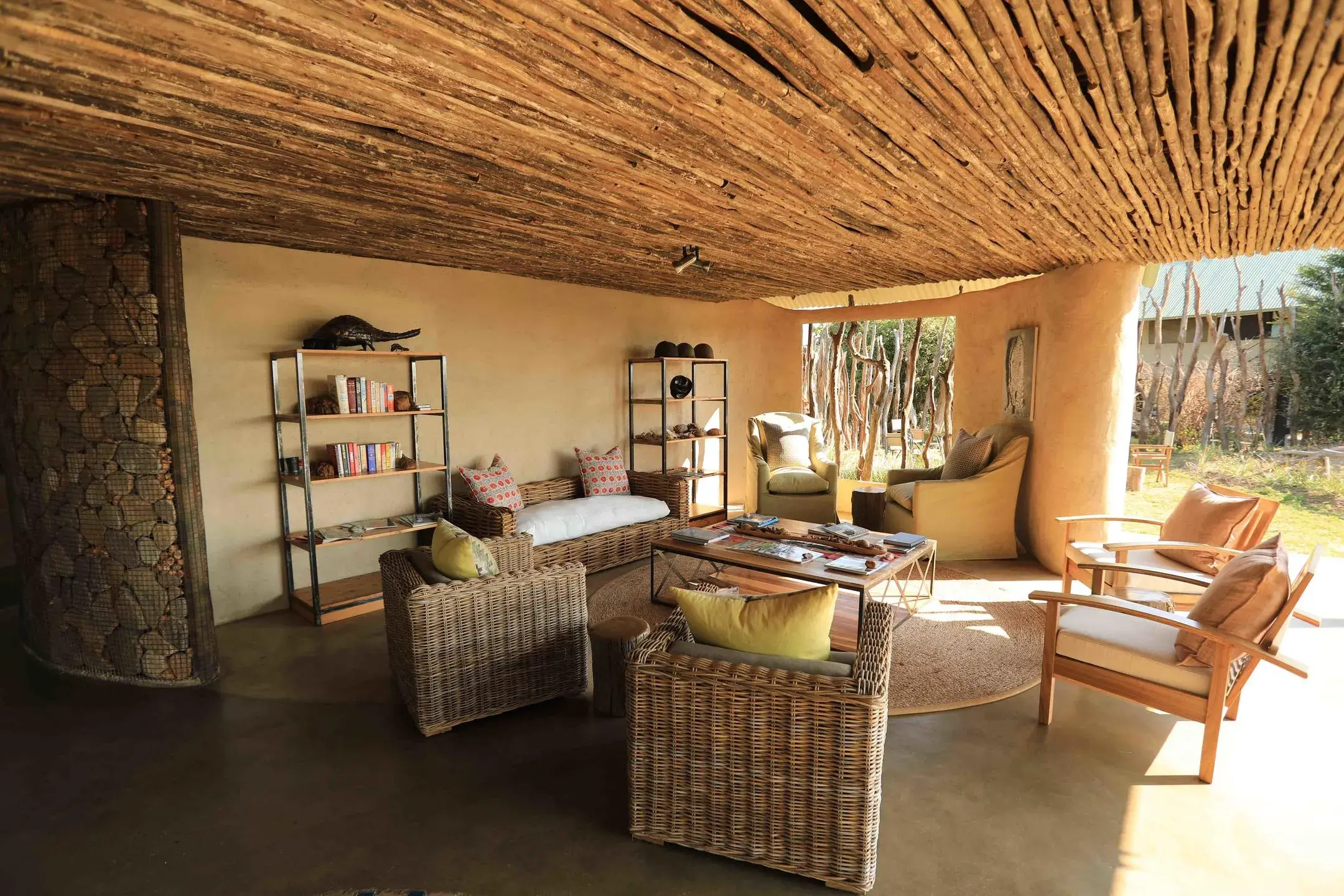 The central dining and lounge area has a deck above, providing a magnificent view across the dry riverbed and to the pan below. The camp accommodates 14 guests in total. (craftedAfri)