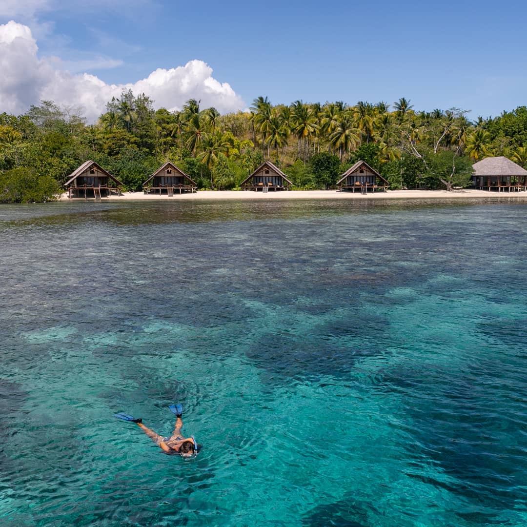 On the grassy hill in the middle of the island you have a wonderful view of the surrounding islands. Enjoy miles of beach, the sea, sunrises and sunsets indefinitely. Swim and snorkel in the crystal-clear waters surrounding the island in privacy – enjoying the bird songs, watch the countless colorful reef fish buzzing around the coral reef while waiting to encounter a sea turtle or baby shark.