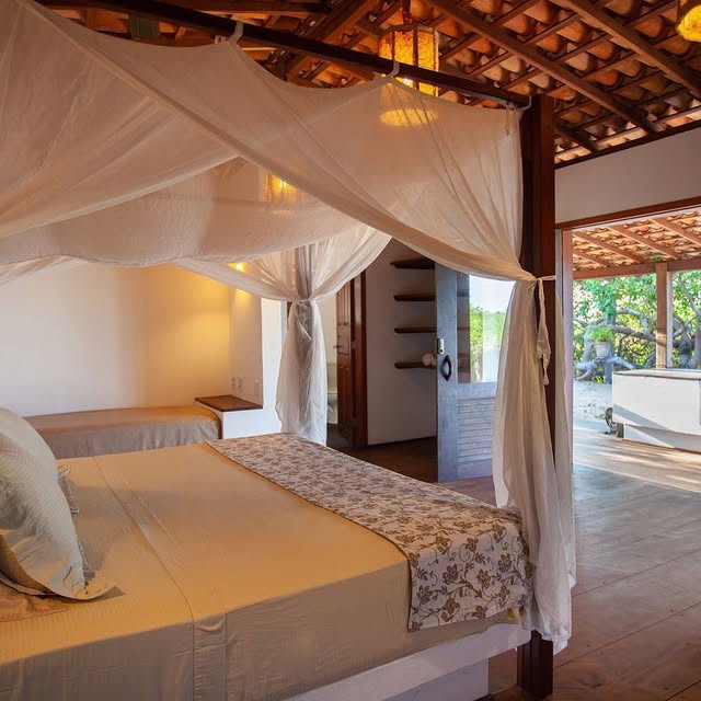 Situated on top of a dune, this elevated wooden lodge rests above the Caju trees surrounding it. From the bungalow’s tower, you can watch the sun set over the sea and sand dunes whilst enjoying a view of the constellation of the Southern Cross.