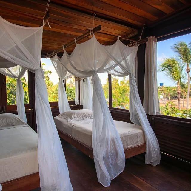 Built on a hilly 2 acres, the white-walled lodges were created from local wood, brick, and palha. All the lodges are equipped with air conditioning and separated by wide green spaces. Designed as a place to socialize and share stories, the Forum offers entertainment such as board games, books, musical instruments, Wi-Fi and background music along with hammocks.