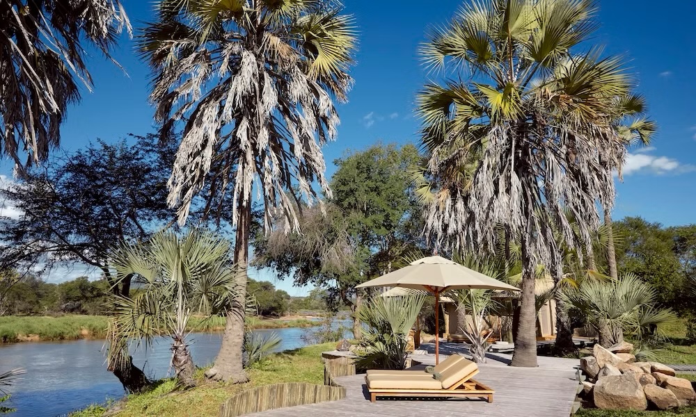 Each stilted tented suite rests on a wooden deck and is covered by a magnificent Makuti thatched roof. Size: around 50m2. Situated on the bank of the Jongomero River, the viewpoint allows you to observe elephants, kudus, baboons and other bush animals in their natural environment. A wooden deck featuring a comfortable daybed awaits you - enjoy a moment of relaxation upon your return from or before setting out on safari.