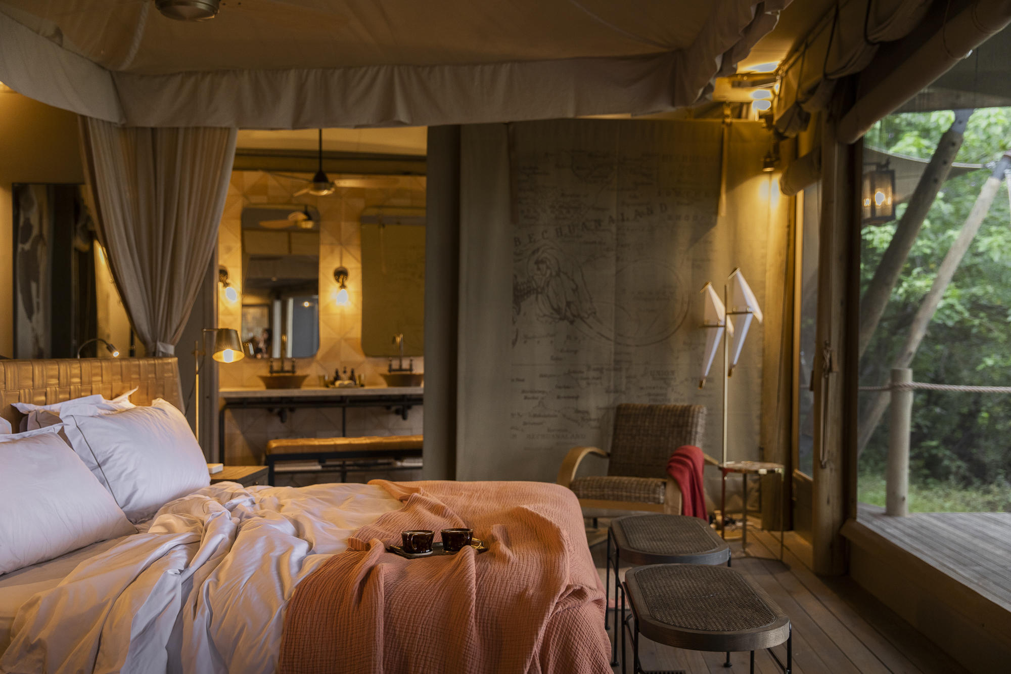 All four tented suites a private plunge pool and a comfortable lounge, and feature a large bathroom with indoor and outdoor showers. The main dining and lounge area boasts its own wide-angle vistas, while a new wellness centre and gym – shared with DumaTau – includes an inviting shaded deck, a lap pool, spa, snack deli and Safari Boutique.