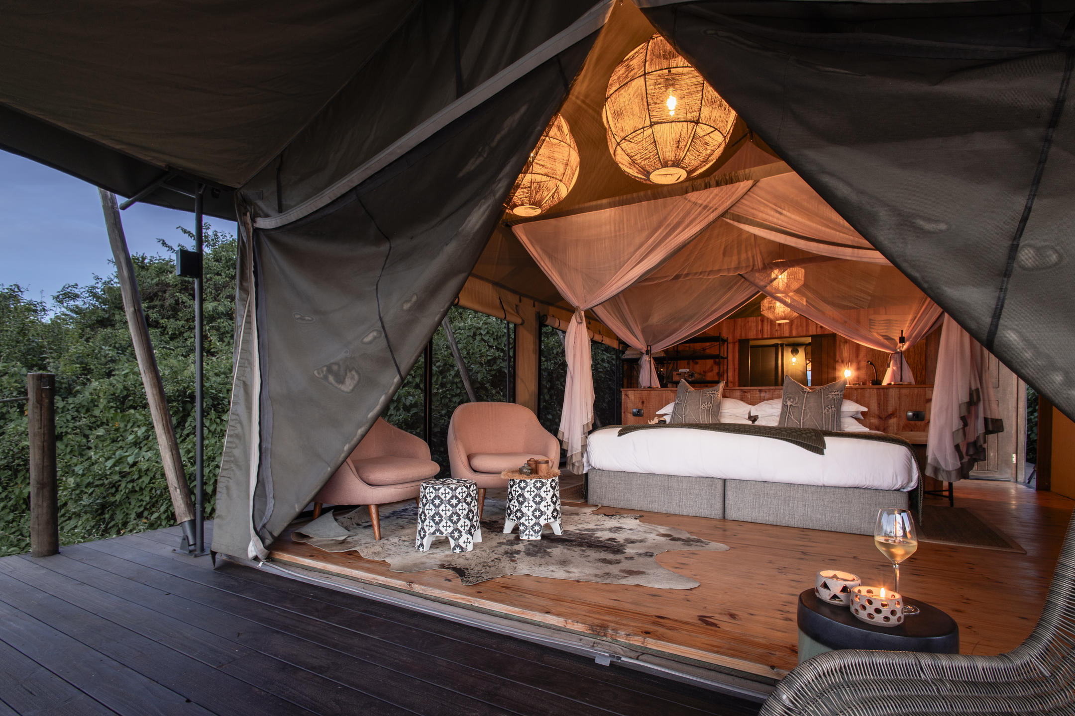 Six spacious and airy tented guest rooms offer uninterrupted views over Lake Rwanyakazinga while Magashi’s main area comprises a luxurious lounge, dining and bar area, wine cellar and pool, as well as an expansive viewing deck with convivial fire pit. The architecture and interiors pay homage to traditional Rwandan culture. (wilderness)