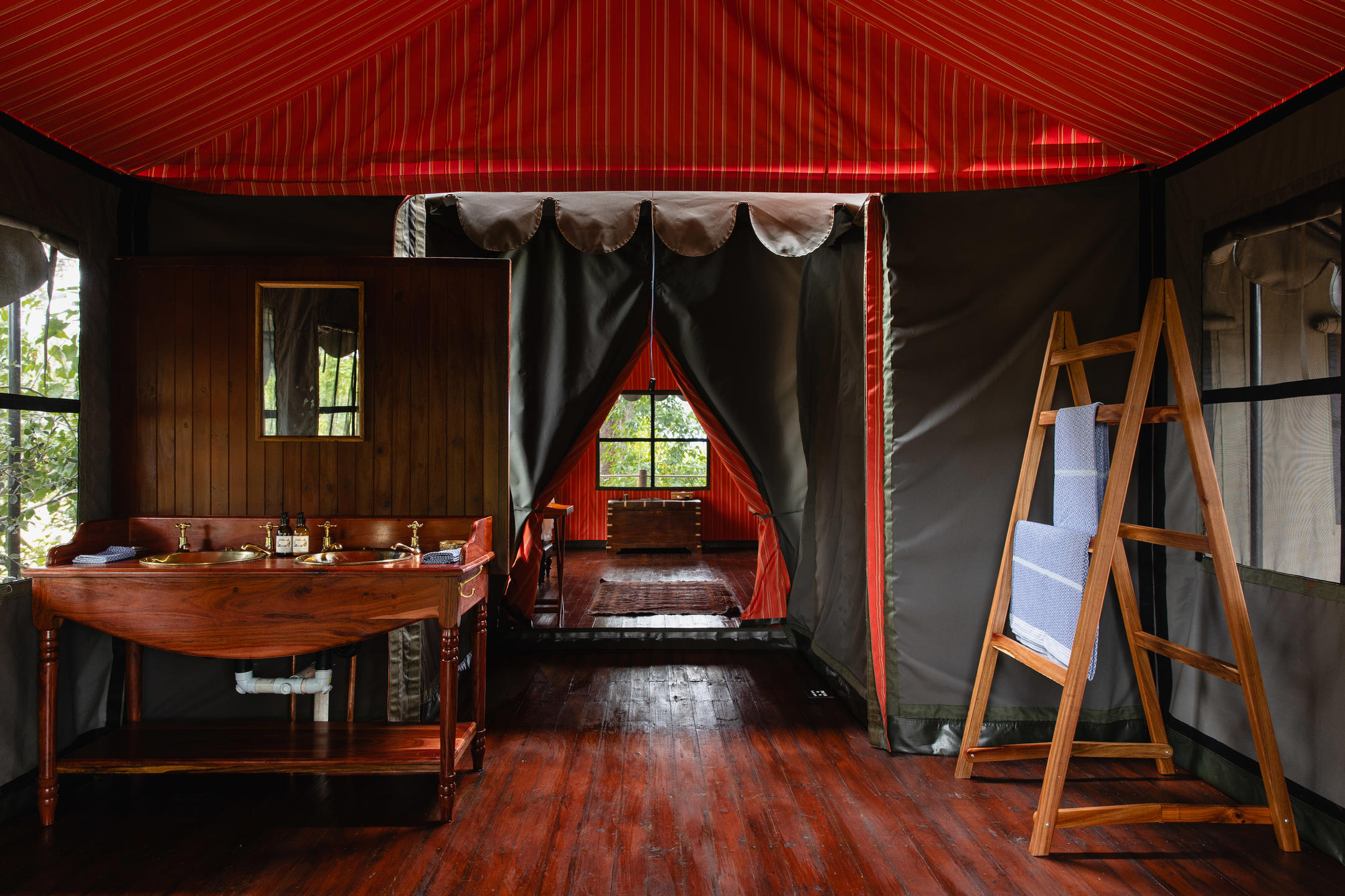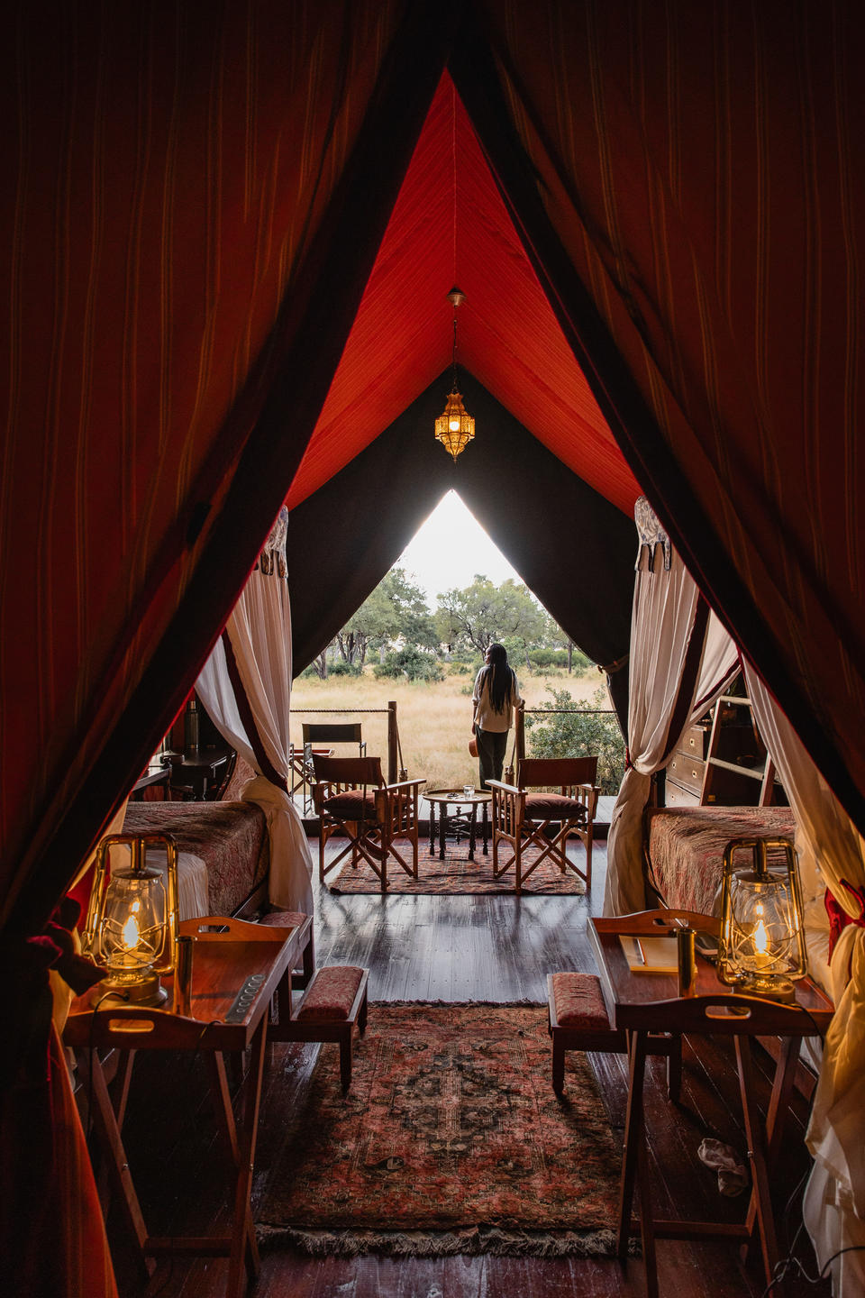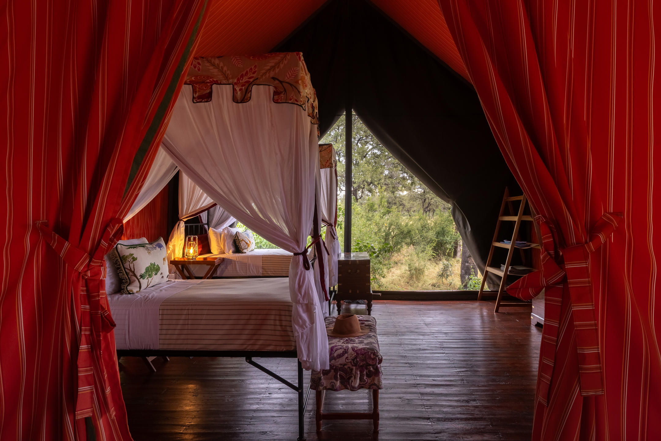 Mbamba offers 2 stylish canvas family tents, carefully positioned under the shade of an impressive stand of large leadwood trees. The cool air-conditioned tents are on slightly raised wooden decks and revel in the much-loved Bousfield vintage safari aesthetic of plush fabrics, mahogany sideboards, Persian rugs and romantic four-poster beds, all infused with a yesteryear charm. Each tent offers spacious en-suite bathrooms and a private veranda that sits elegantly under the bows of the trees to offer respite from the heat, and stunning views of the Okavango Delta.