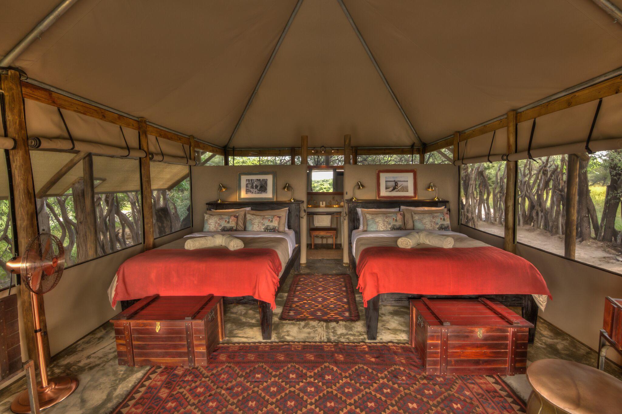 (6 ROOMS) All of the 6 twin tents include 2 x queen sized beds, with views over the Boteti River, into the Makgadikgadi National Park. These tents can easily accommodate2 adults and 2 children and along with the indoor ensuite, each has its own private outdoor shower, fan as well as veranda with a day bed and seating area Please note that the queen beds can not be split Max: 2 adults and 2 children Children of all ages welcome
