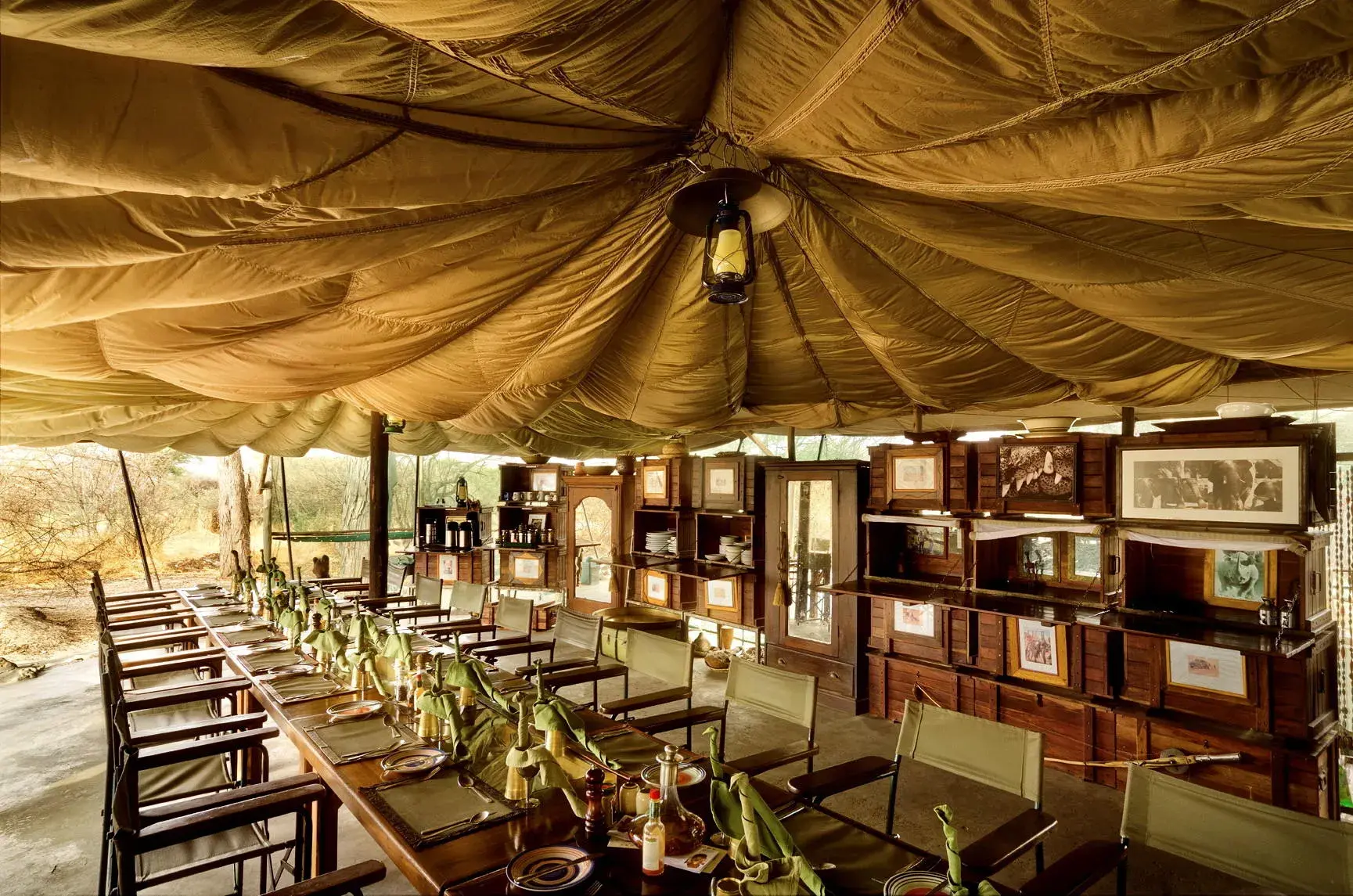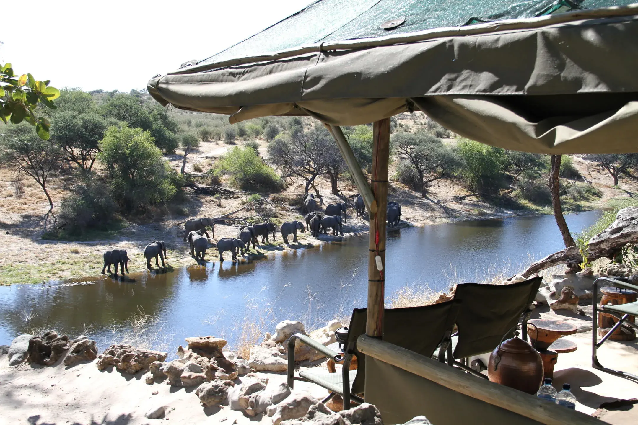 The canvas lounge and dining tents are piled high with books and trinkets, and decorated with old-world artifacts, and our piece de resistance – a sculpted crocodile! And it’s not there for no reason – Meno a Kwena literally translates as “teeth of the crocodile.” Keep an eye on the river below from just about any comfy chair in the living area, or plunge into the Flintstone-esque rocky swimming pool, and watch the animals doing the same below you. (natselect)