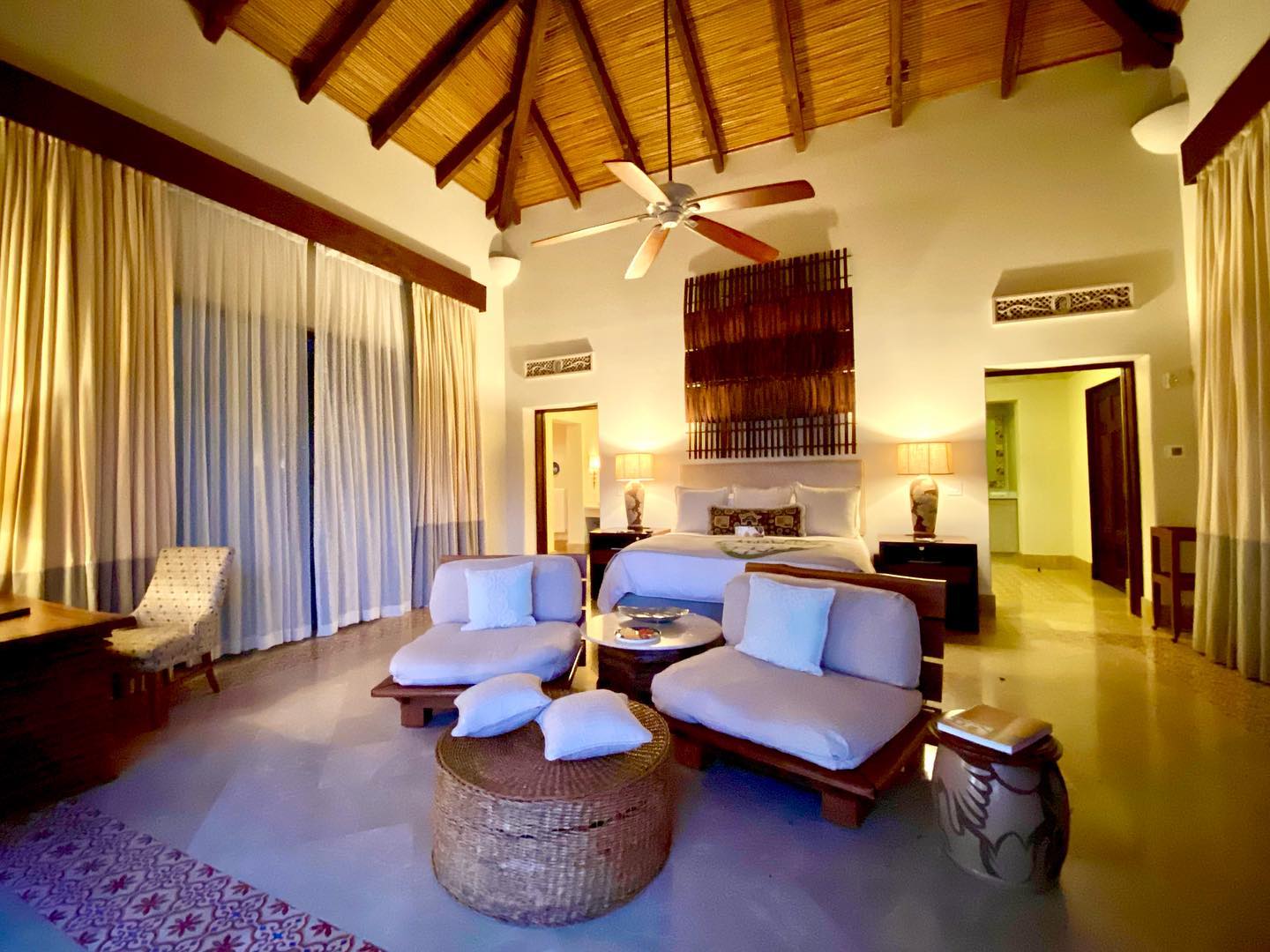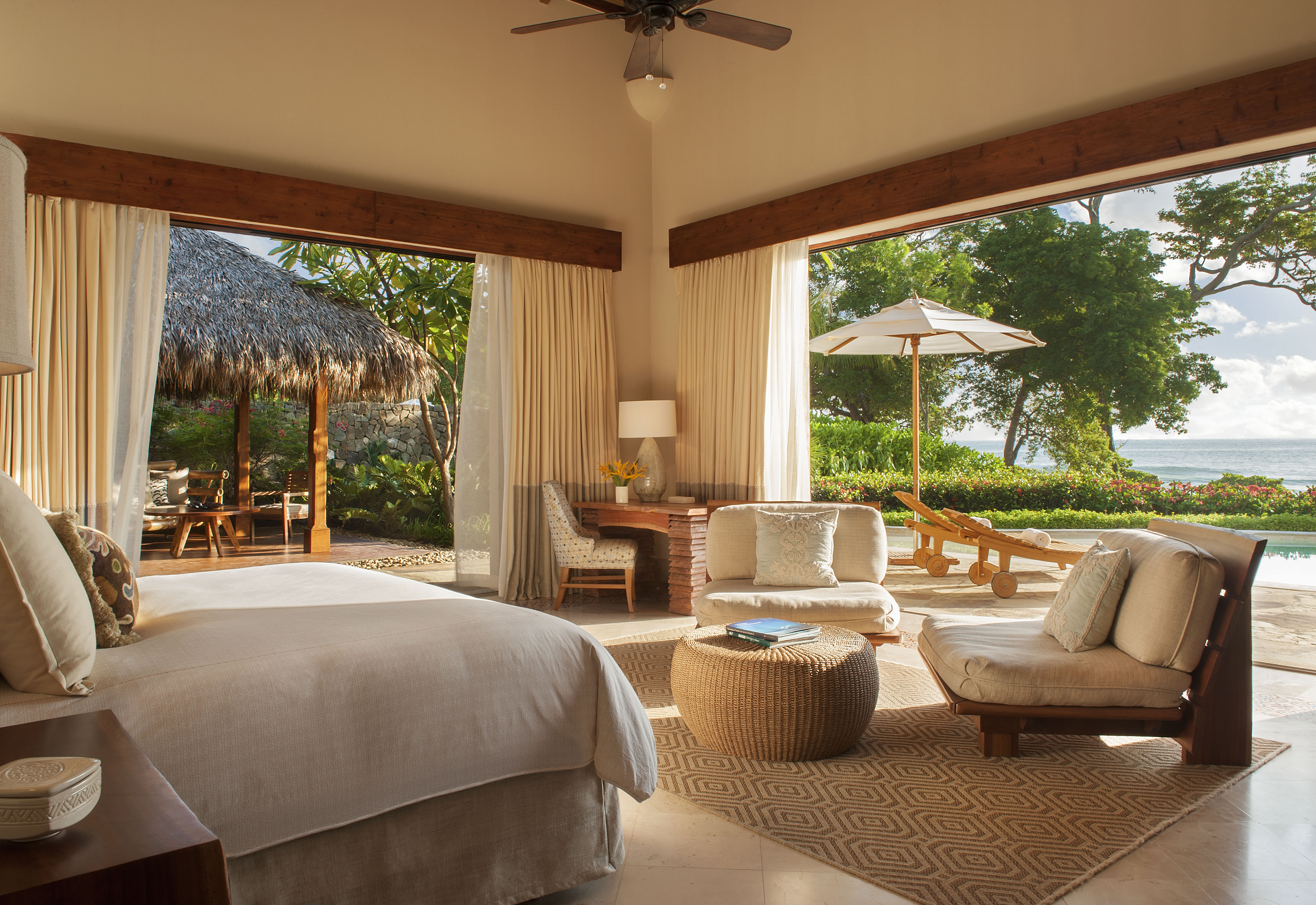 Built of sustainable native teak and pine, each of the 5 Bohios feature floor-to-ceiling glass perfectly framing views of either the golf course and mountains or the sapphire sea below. A sliding glass door leads onto a sweeping wooden deck with a private plunge pool and separate lounging veranda with custom daybed. The spacious bathroom is surfaced in Nicaraguan travertine marble and includes a wet room, double vanity, spacious walk-in closet and double-headed shower. The furniture, fabrics and lighting fixtures also lend to the authentic feel of a posh sanctuary handcrafted in a refined local style.