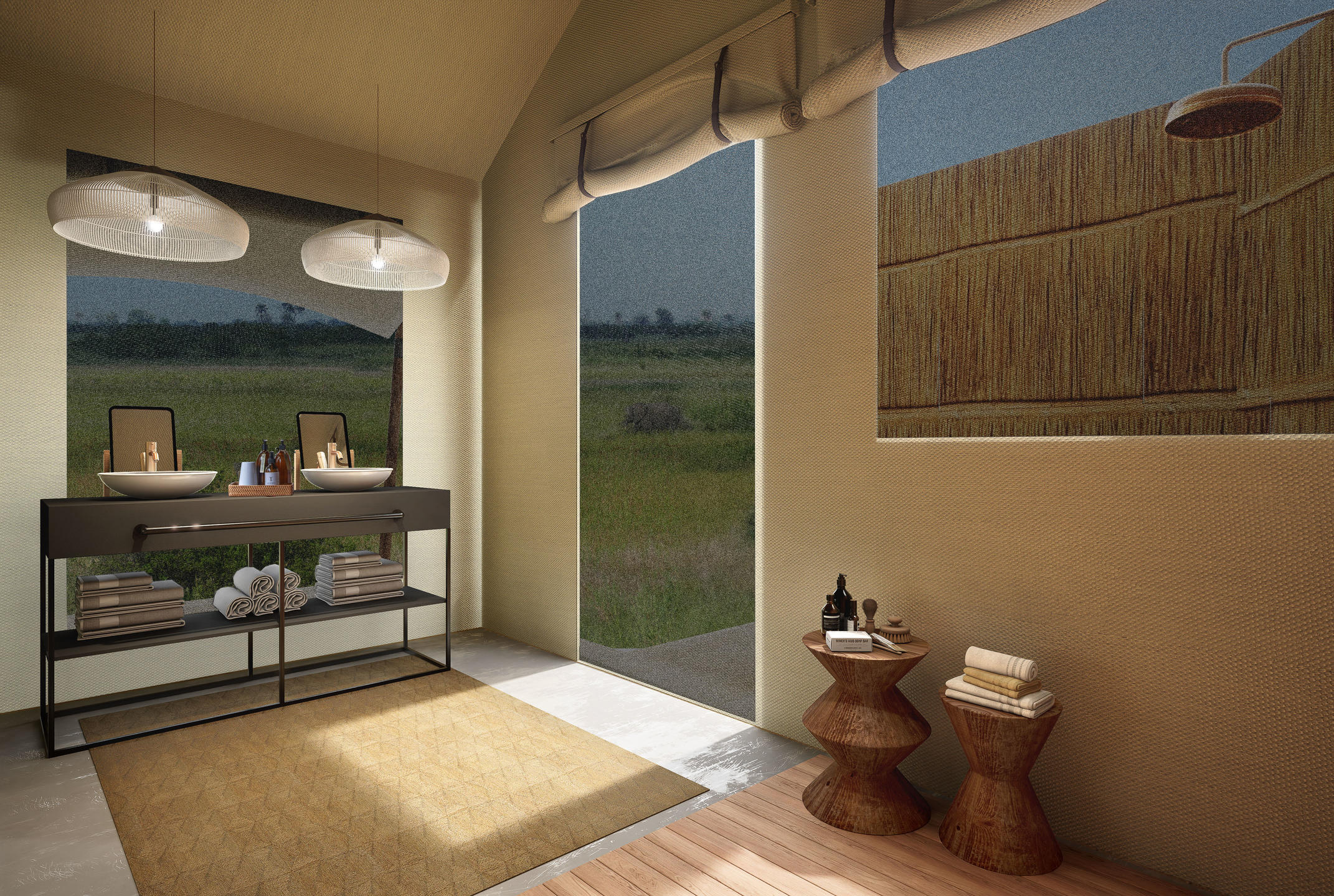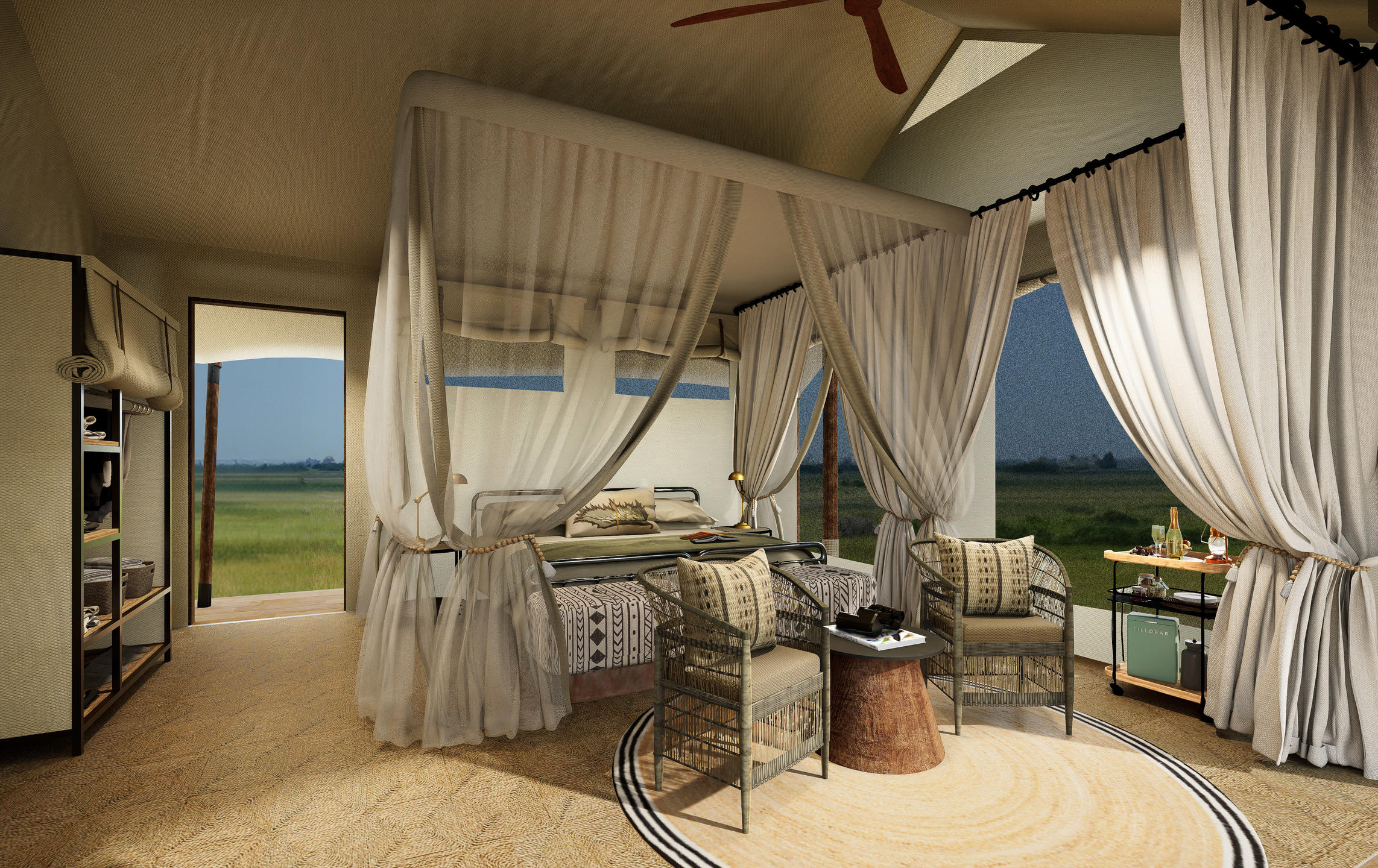 Shaded beneath leadwood and sausage trees, Nkasa Linyanti is a contemporary under-canvas camp offering modern comforts amid the lush wilderness of the Nkasa Rupara National Park. The camp’s six under-canvas tents are raised on wooden stilts, carefully designed to tread lightly on the delicate wetlands ecosystem while providing views across the floodplains. Positioned to take full advantage of this remarkable wilderness, each tent boasts canvas walls which open wide to invite the sweeping floodplain views to flow through the space. Entirely unfenced, Nkasa Linyanti offers a front-row seat to the pristine wetlands of the Linyanti ecosystem. Indoors, organic tones and textures echo the natural landscape: think woven baskets, hand-crafted cane chairs, and canvas furnishings paired with pared-back safari elegance and a contemporary African motif. Beds are draped in billowing mosquito nets, while en suite bathrooms offer both indoor and outdoor showers for an indulgent and immersive bush experience. Bright, open, and airy, the elegant communal area flows seamlessly from the contemporary lounge and bar area – ideal for trading tales of your day’s adventures – to the al fresco dining terrace shaded by wide sweeps of canvas.