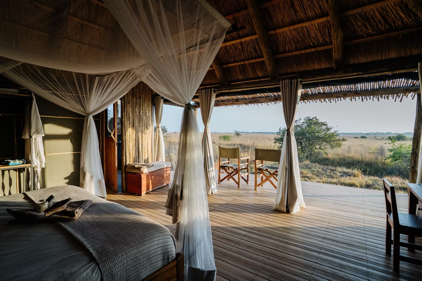 The accommodation at Ntemwa–Busanga consists of five well-spaced reed-and-thatch chalets raised slightly above the ground on wooden decks. Guests can choose between twin or double beds with mosquito nets, and additional furniture includes bedside tables with reading lights, a hanging rail, a small chest of drawers, and a simple shelf for your luggage. You’ll also find mosquito repellent, a water flask, and a whistle for emergency use. Each chalet has a shaded private veranda, from which you can enjoy the view between game drives. At the back, each open-air en-suite bathroom contains a flush toilet, a jug-and-basin, and a classic bucket shower. Hot water is provided every morning, and water for the bucket showers is available on request at other times.