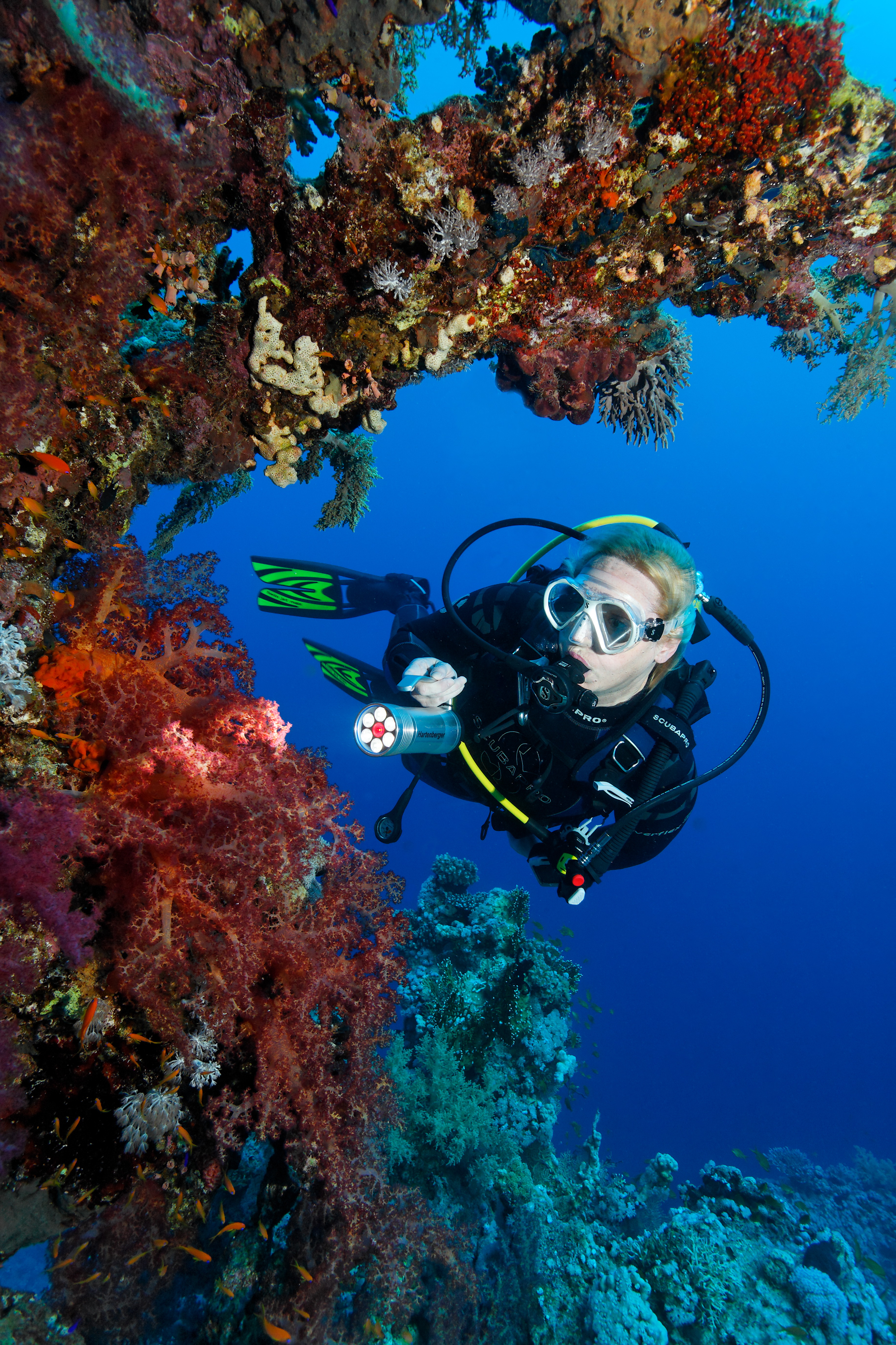 There is something here for everyone, either gently sloping dives from the beach, trips by car to more remote bays or boat/ zodiac excursions to legendary reefs such as Elphinstone, Abu Dabab and Samadai Reef (Dolphin House). One of the world’s best divesites, Elphinstone Reef can be reached in 20 Minutes by Zodiac. Longimanus (Oceanic), hammerheads and tiger sharks glide past the drop off. Millions of red jewel fairy basslets populate the overgrown hard and soft corals, gorgonians and sponges. A must for any experienced diver.
