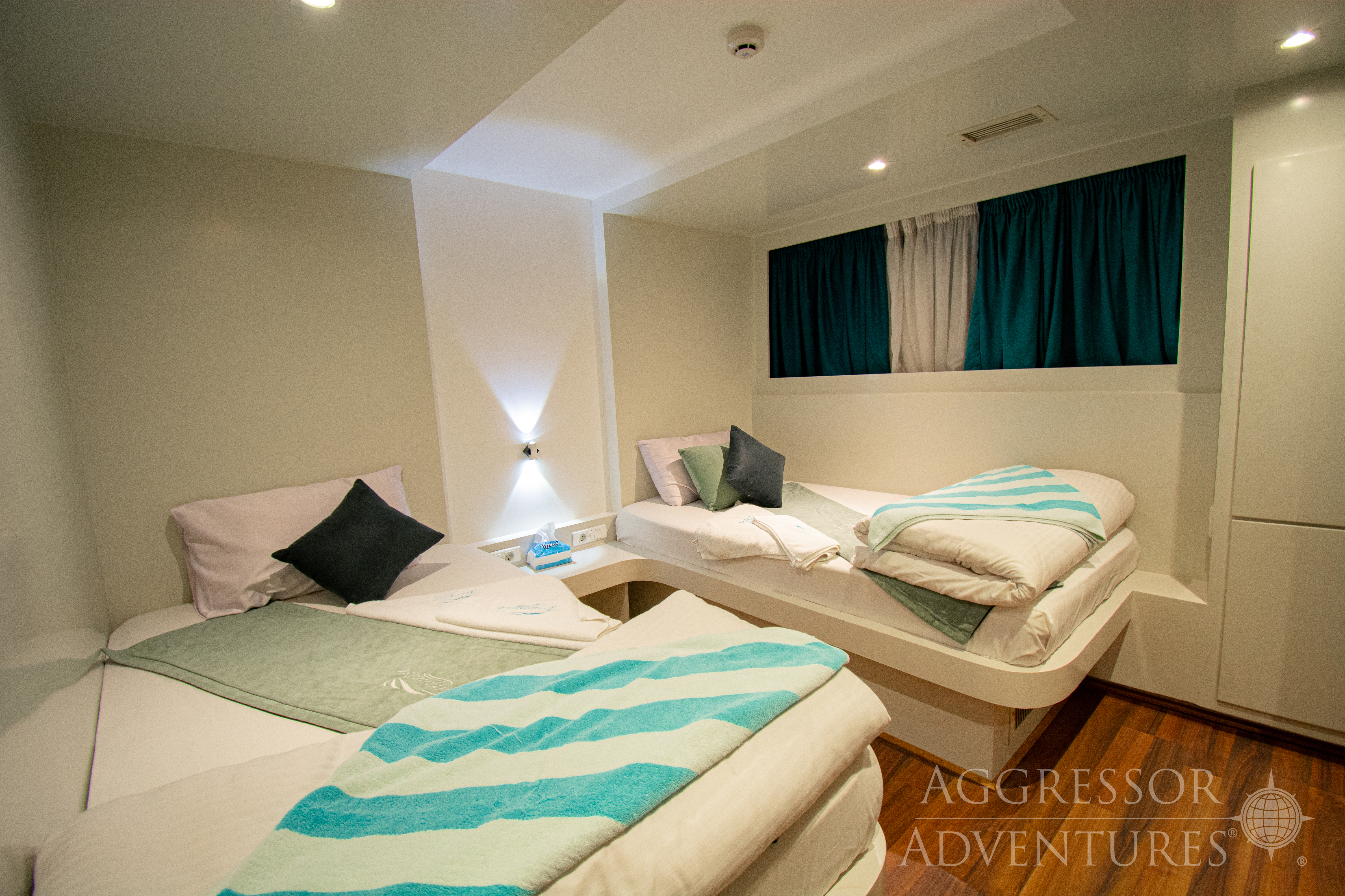 A comfortable stateroom located on the either the main deck (#1 - #3,) or the upper deck (#6 - #11) each with two side by side beds. Staterooms have a large picture window with a private bathroom and shower with a porthole. Your stateroom is the perfect place to read a book, nap in between dives, and fully recharge for the next day.