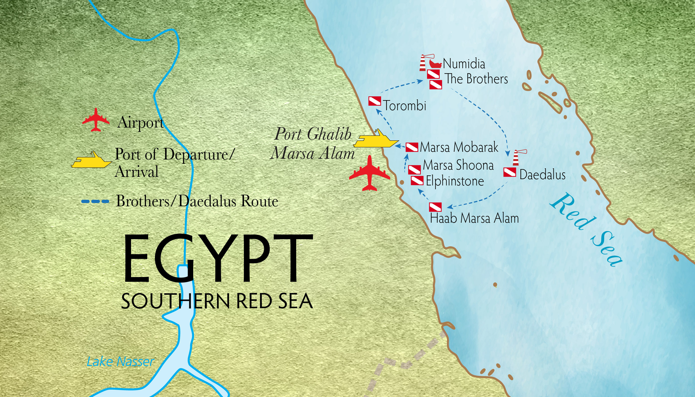 The Red Sea Aggressor IV operates from the Port Ghalib yacht marina and resort area. It is a beautiful gated upscale resort community that is home to the 141 ft., 26 passenger yacht and includes lots of restaurants and shopping. All weekly trips run Saturday to Saturday.