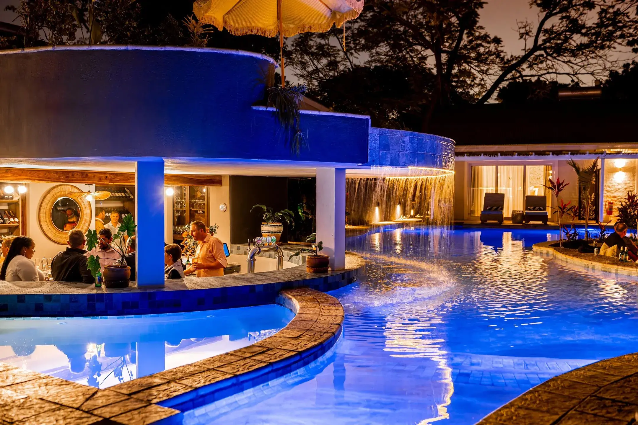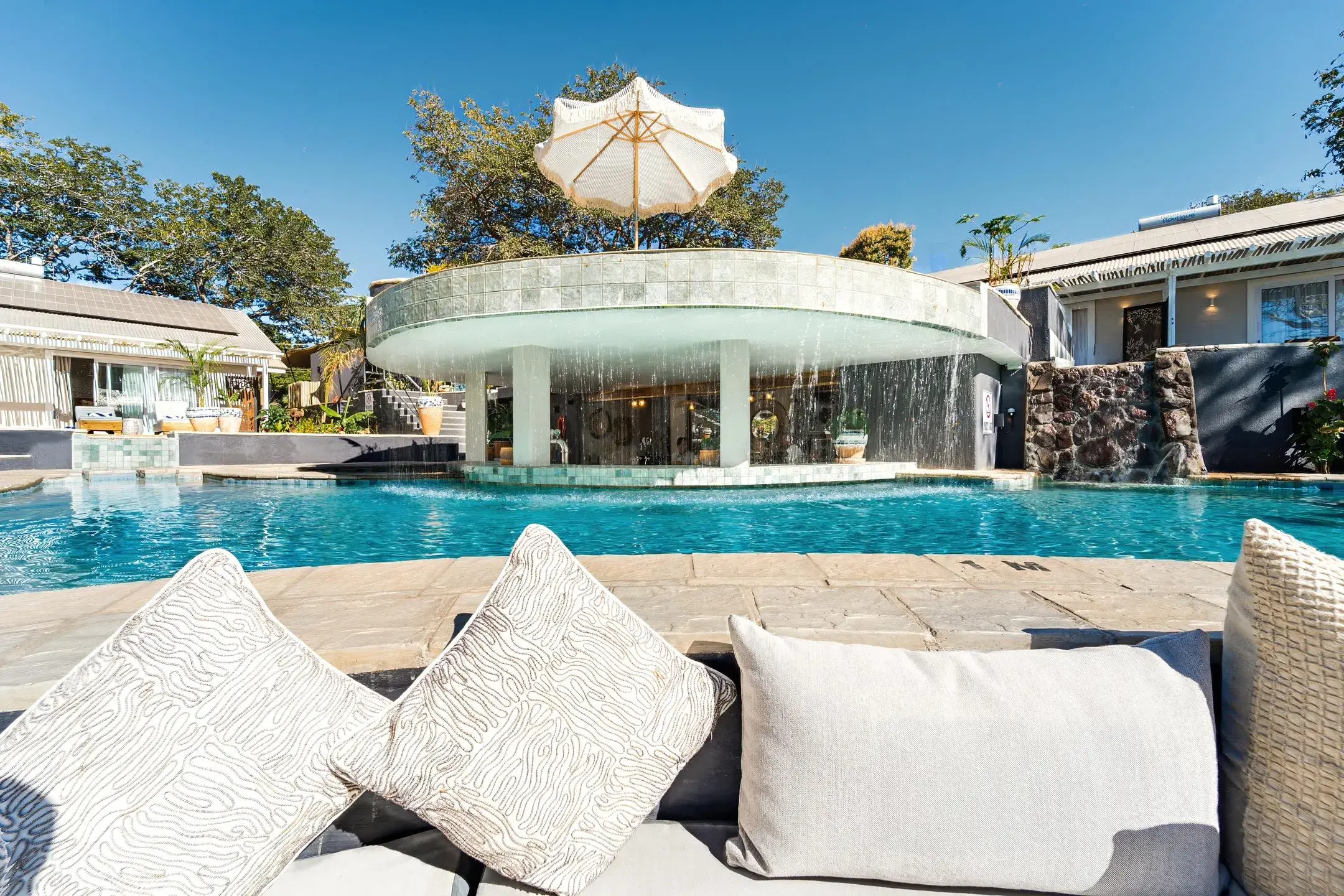 A luxury room located near the pool with an outside pool view and entrance. It combines comfort and privacy with a relaxed, open-air feel , offering direct access to our outdoor pools and lush gardens.