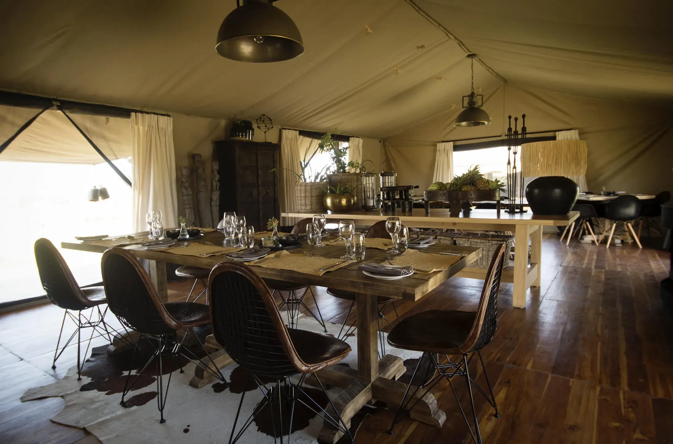 (10 TENTS) The camp has 10 accommodation tents, each measuring 45 square meters to include a private verandah. A two-bedroomed family tent is available for guests traveling with (small) children. Each tent sits atop a wooden platform raised 30 centimeters from the ground and has a generous sleeping area complete with lounge space. An ensuite bathroom with “his and hers” wash hand basins, large shower and proper flush toilet complete each guest tent. The family tent is appointed to the same high standards. A great deal of thought has gone into the detail of each tent and, as you would expect in a property of this standard, an in-tent safe, hairdryer, toweling robes, a gas fired heater for use on cold nights, leather fasteners with brass buckles on windows and doors and an array of other carefully thought out finishing touches are only some of the surprises we have in store for guests.