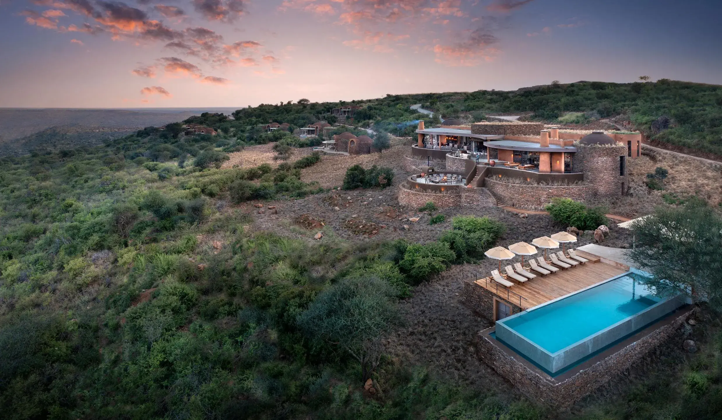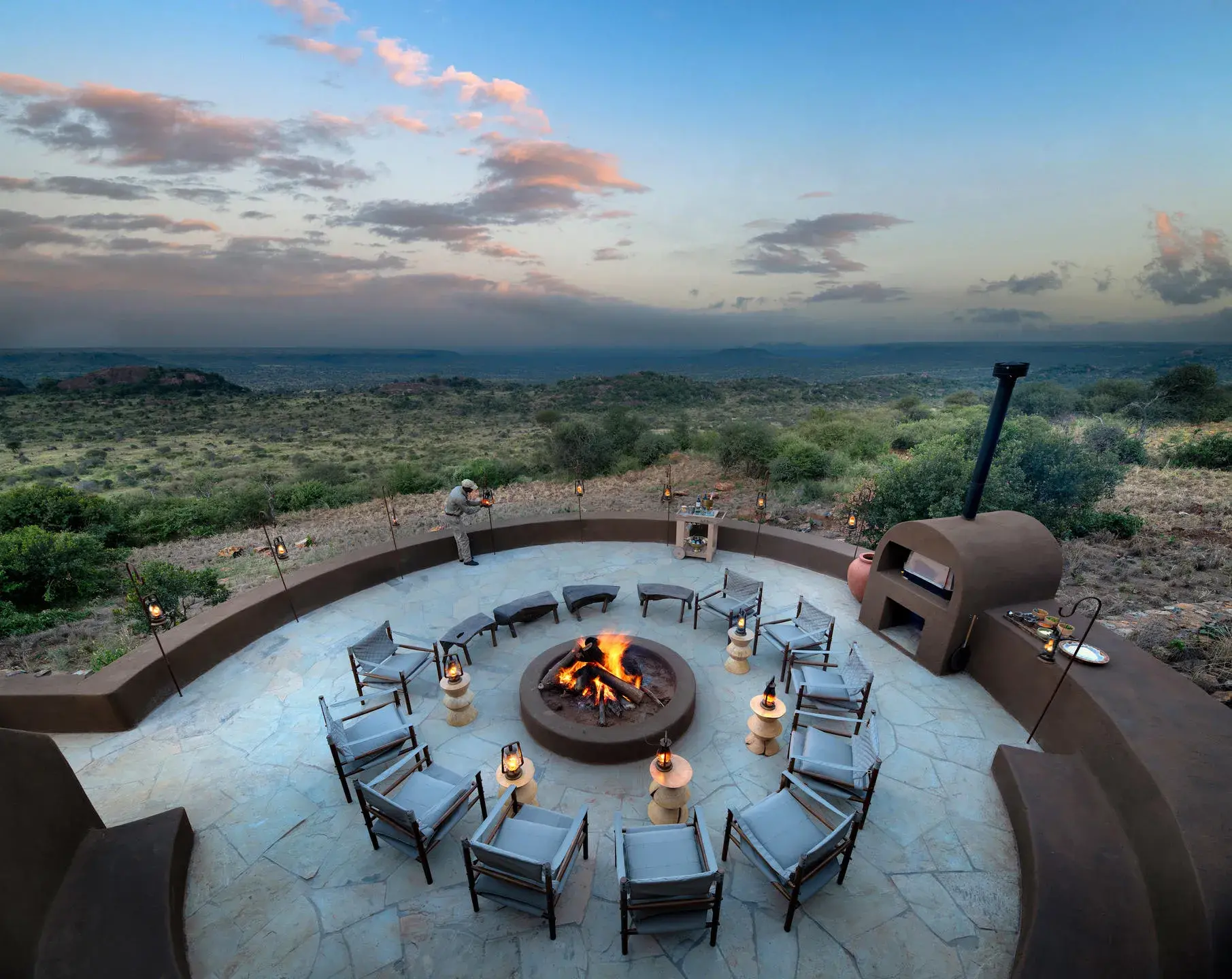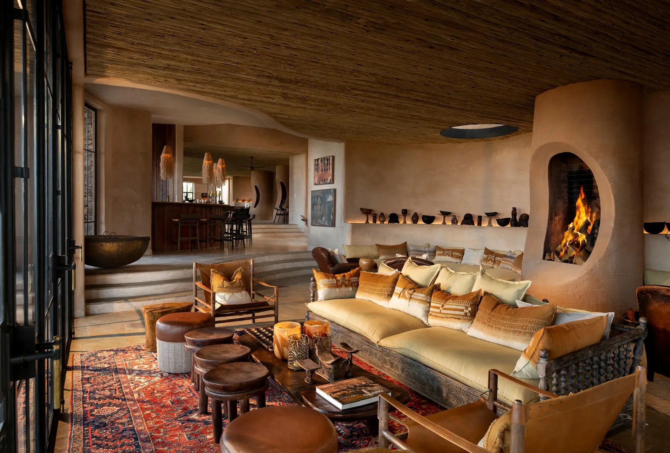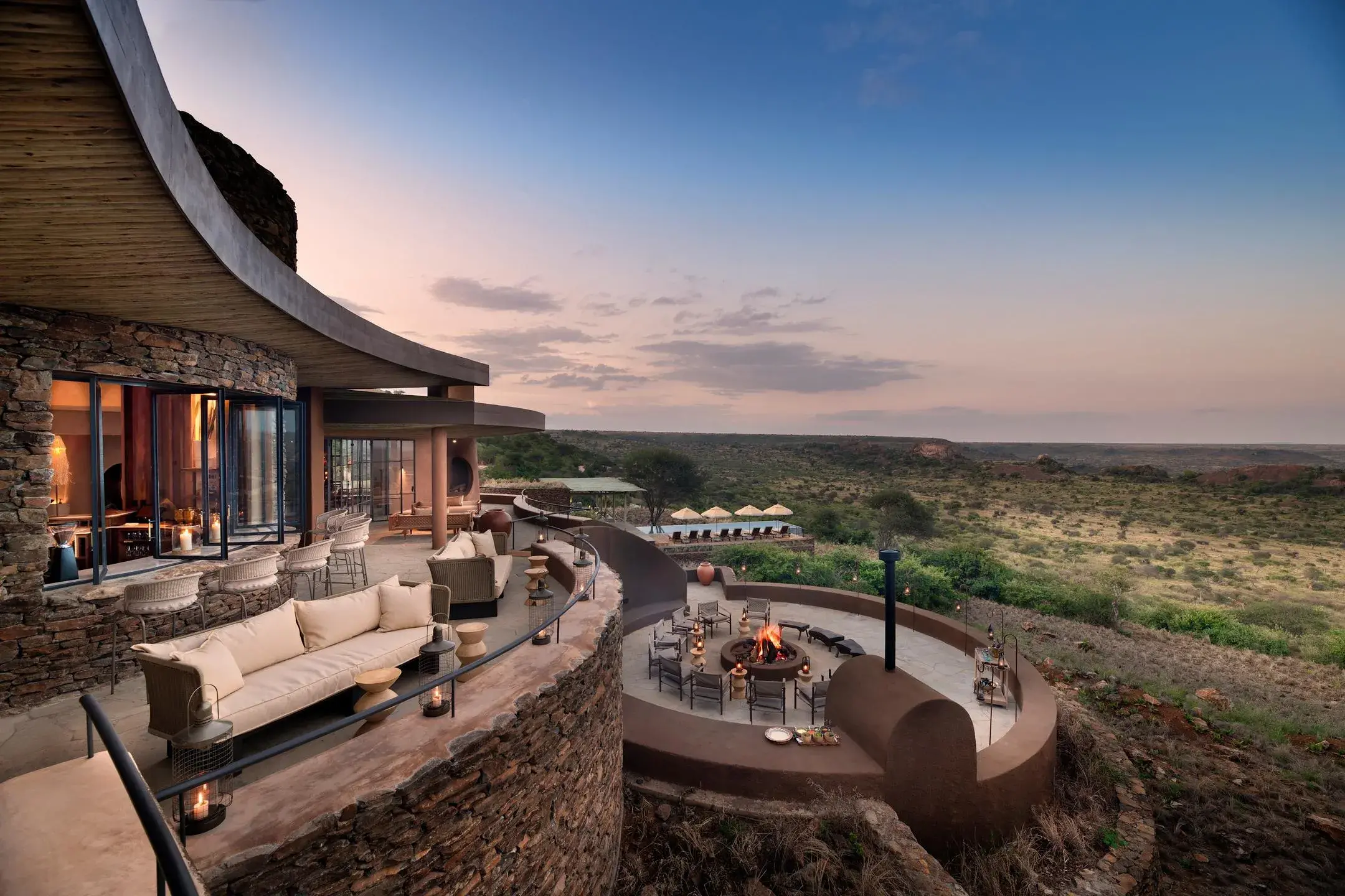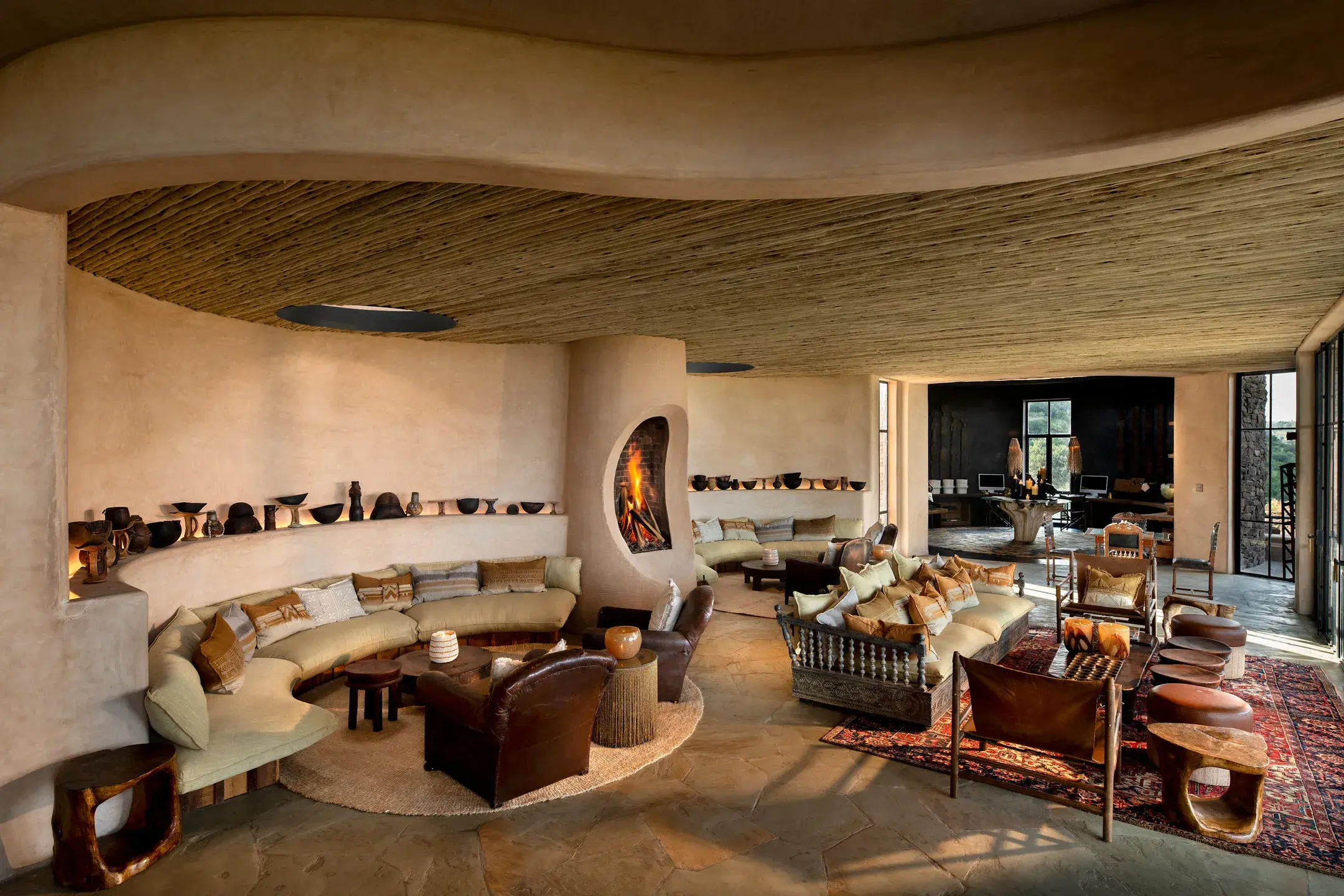 The lodge’s guest area echoes the flow of the kopjes across the valley, offering the perfect vantage point for viewing the conservancy’s incredible habitats along with the abundance of wildlife that calls it home. Accessed by a winding stone path, the lodge’s entrance courtyard opens onto a large circular, central bar that showcases breathtaking views of the open plains, while intimate, softly lit areas create cocoon-like spaces for guests to escape.