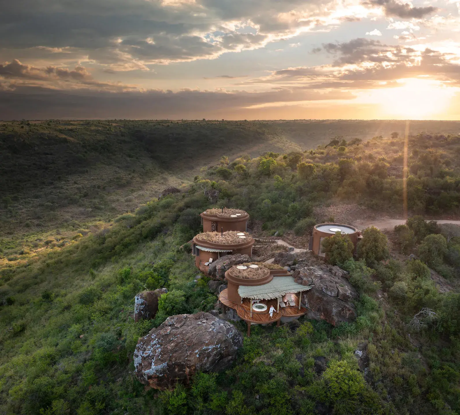 A sculptural structure of architectural brilliance, the lodge draws inspiration from its unique surrounds and its rounded appearance with plant growth atop mimics the region’s ancient rock formation and the robust plant life that lives in between the granite edges. A harmonious blend of raw, earthy Africa materials with a contemporary flair, the lodge reflects the Japanese Wabi-Sabi sentiment of taking pleasure in the transient nature of earthly things. Subtle cultural touches inspired by the local semi-nomadic Samburu tribe infuse with modest luxury while mottled undertones pay homage to the region’s most cherished wildlife, such as the rare African wild dog and elusive black (melanistic) leopard. Rich textures and colours enhance the lodge’s understated yet sophisticated feel, and the majority of the furniture and finishes are locally sourced and crafted by Kenyan artisans.