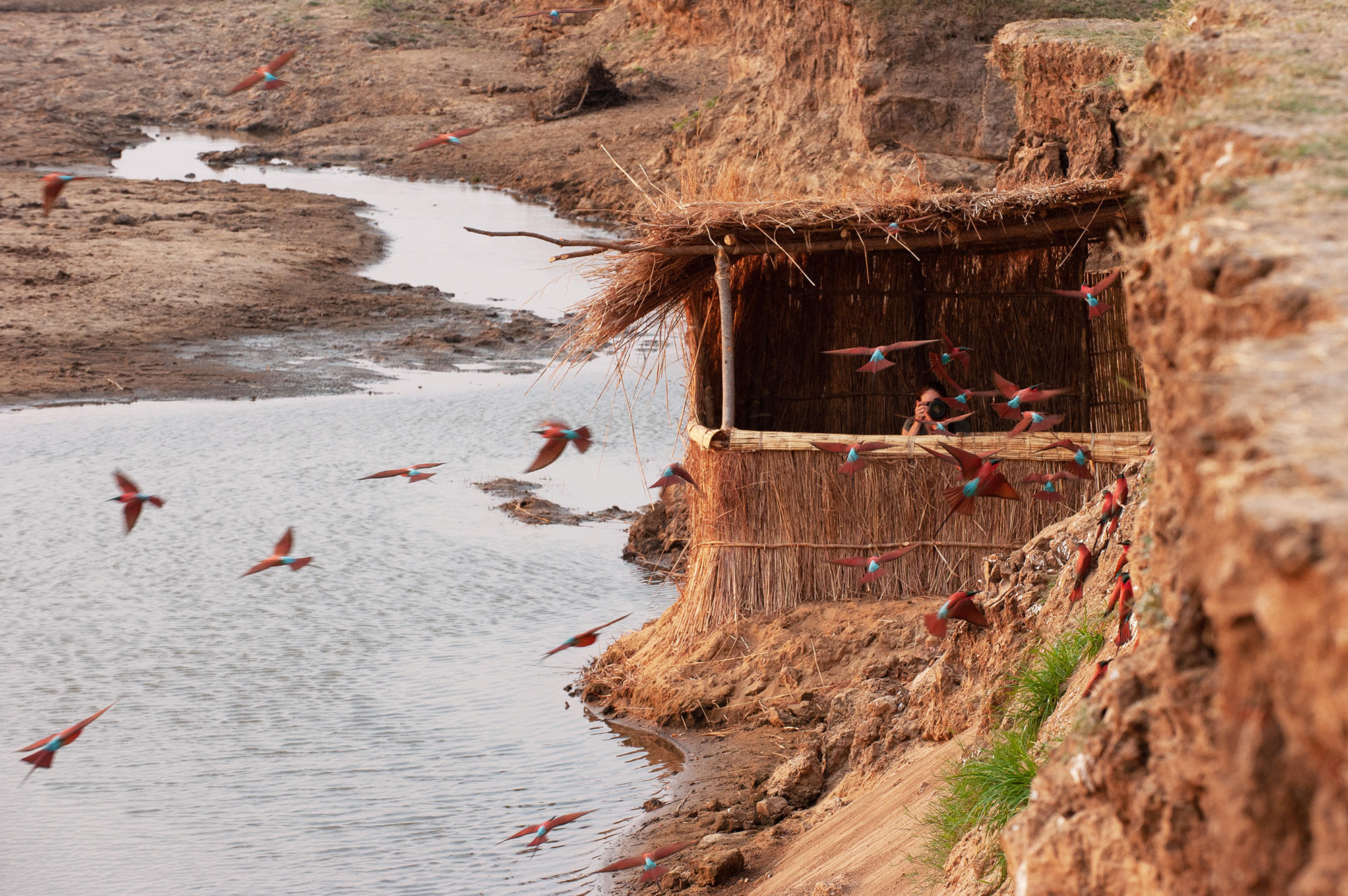 The Tafika camp hide is available to all camp guests and can be accessed any time of the day from the camp. The hide is a dug out seating chamber that looks out over a lagoon behind the camp. Birds, baboons and antelope frequent the lagoon and elephants visit on a daily basis from about August during the hotter time of the year. A seasonal Carmine bee-eater hide is built annually at Tafika. The hide is built into the banks of the Luangwa river to gain the best view of the carmine colony as they flock around their newly dug breeding holes. This hide is generally available during September and October and visits to the guide are done with a guide. Tafika guests are also able to visit the Kawere hide during a game drive activity. It is built on the camps private land and overlooks a productive waterhole where elephants and buffalo come to drink and fishing parties frequent towards the end of the season.