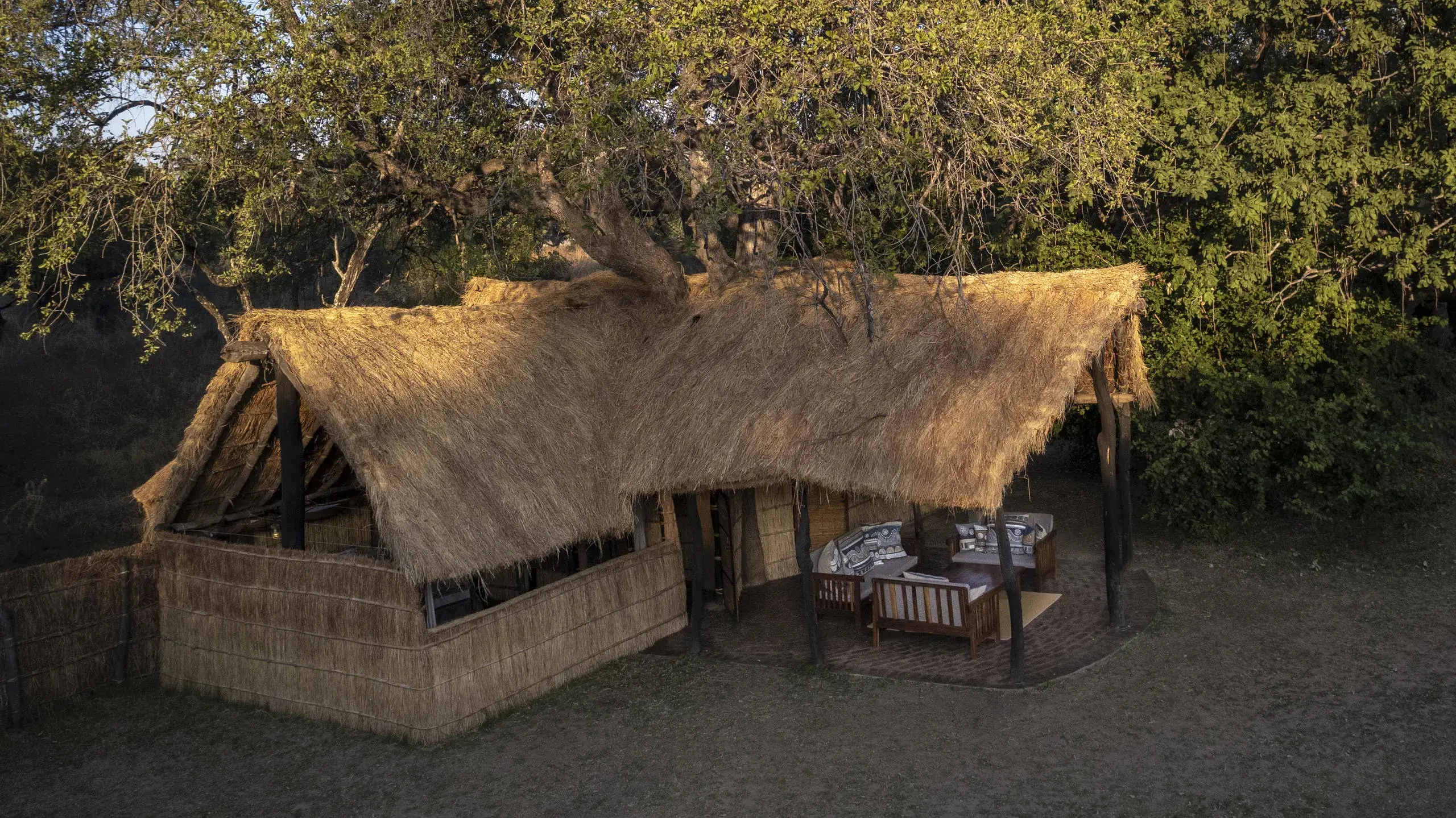 (4 ROOMS) Each thatch chalet has two double sized beds, under-cover veranda, en-suite bathroom with double vanities, flush loos, hot and cold running water and solar powered lighting.
