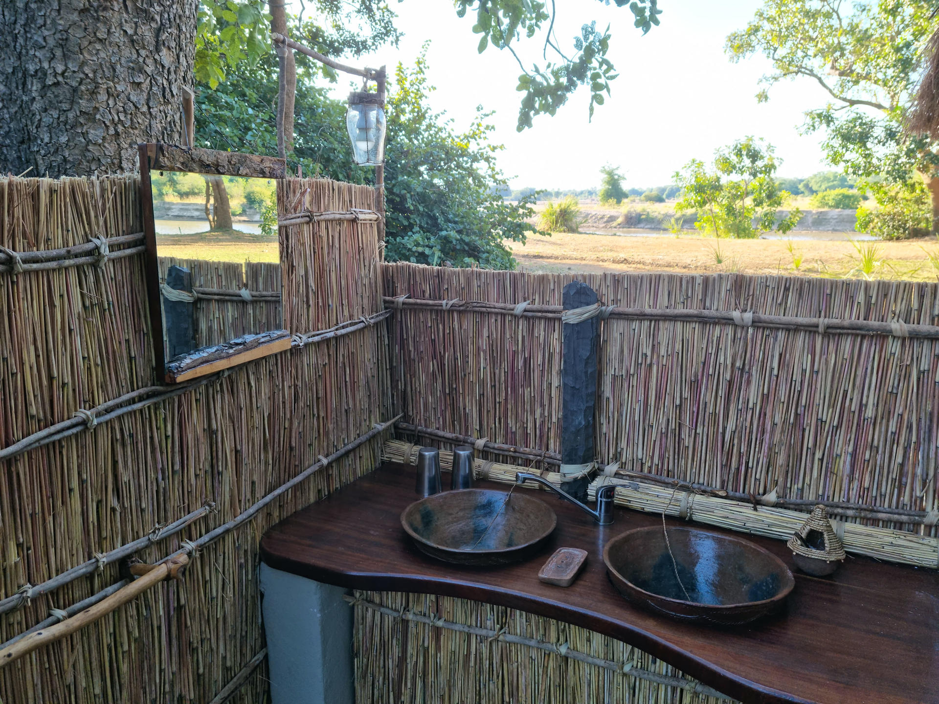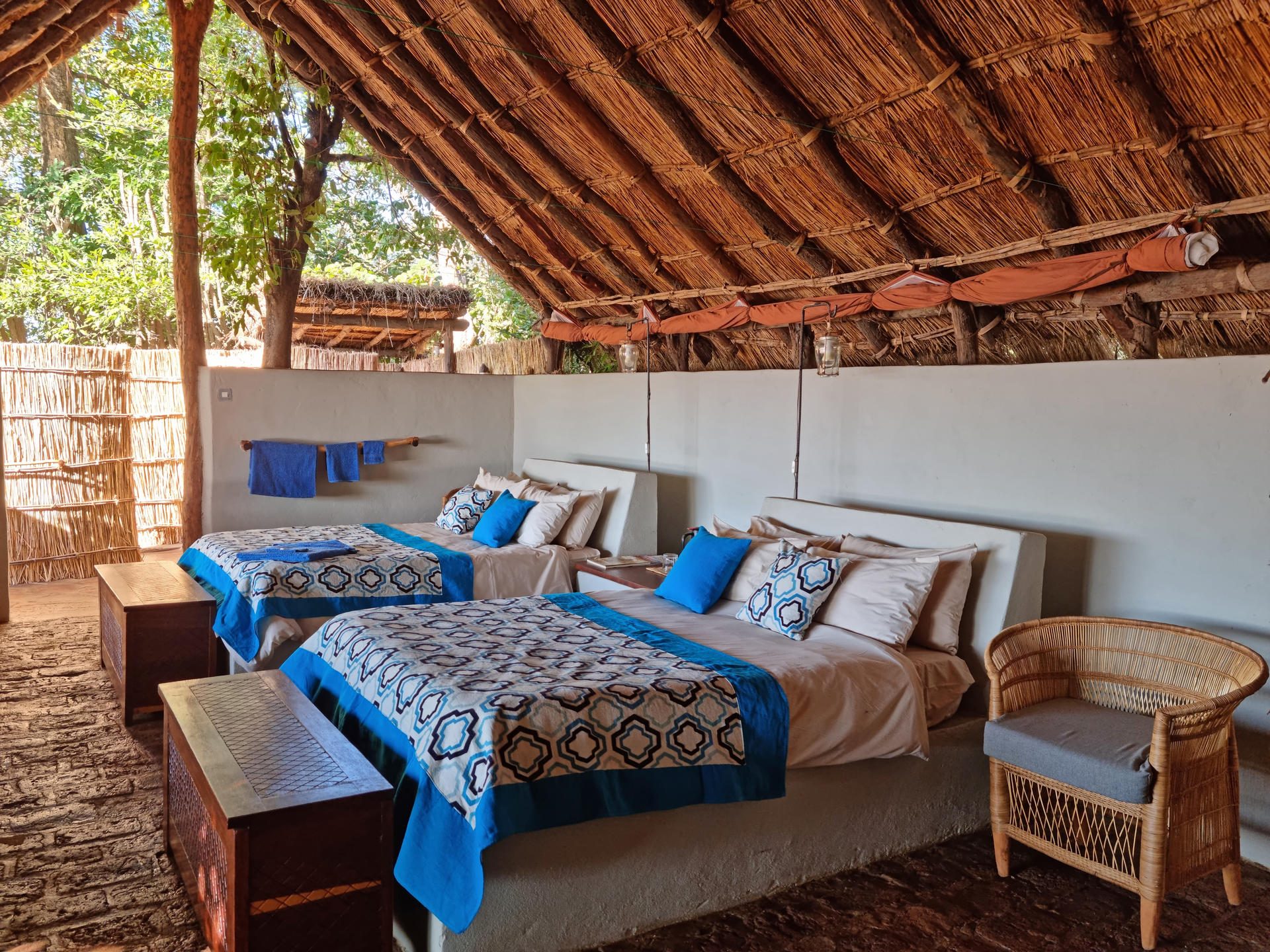 (3 ROOMS) Twin chalet with two double beds. En-suite facilities with shower, basin and toilet. Running water with hot water available at all times. Verandah looking out over the river. Brick base with natural thatch walls and roof made from natural materials and local skills.