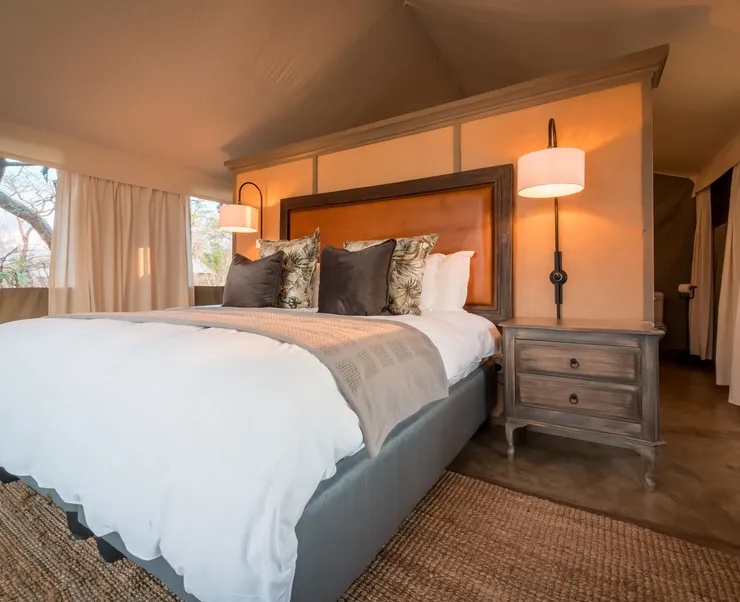 Zingweni Vlei features four meticulously designed tented suites, each a sanctuary beneath shady teak and umtshibi trees. Spacious and airy, the tents are adorned with bespoke furniture crafted from rich teak wood, complemented by carpeted concrete floors and white denim-lined walls. Thoughtfully curated linens, earthy tones, and artisanal touches immerse guests in the wild beauty of the bush while maintaining unparalleled comfort.
